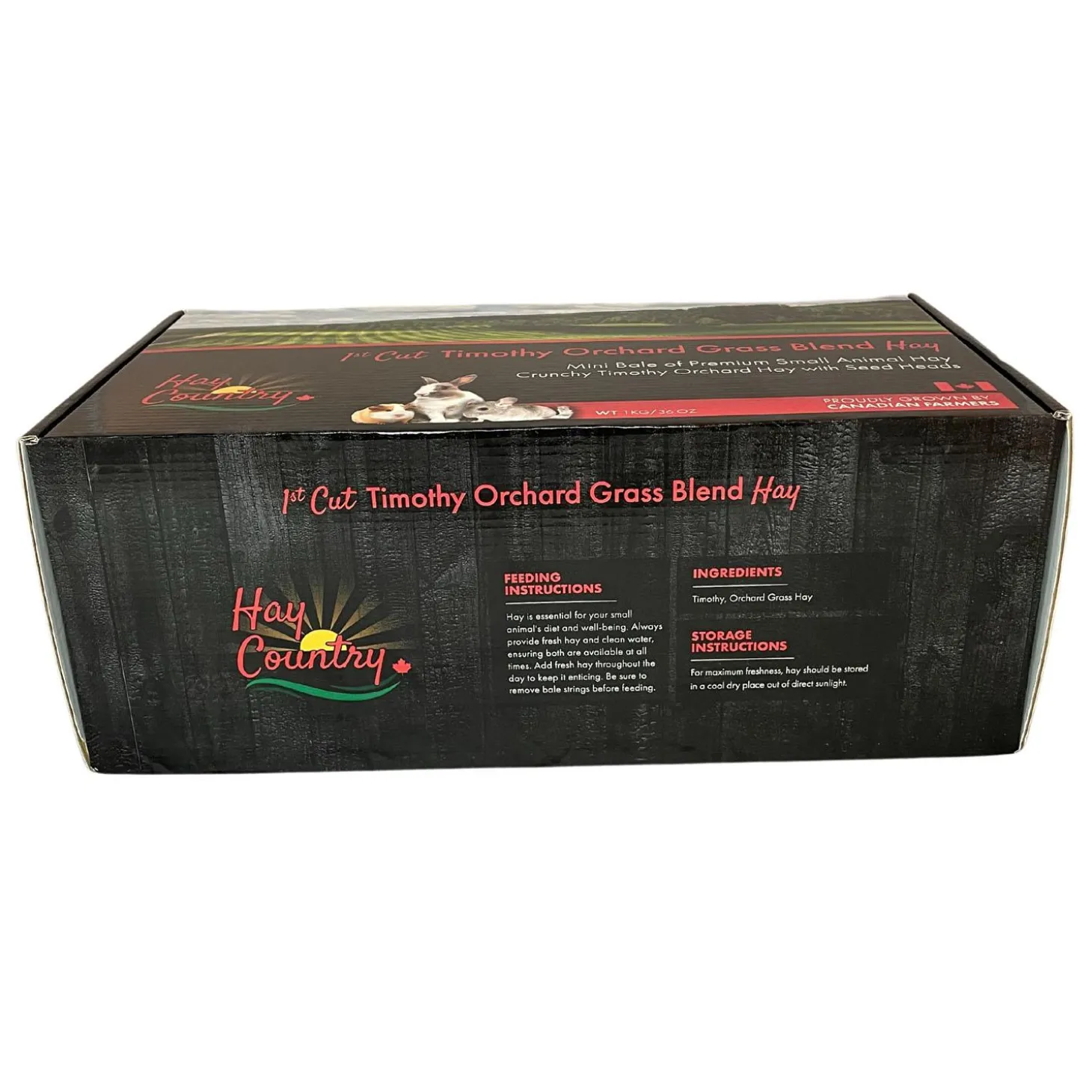 Hay Country 1st Cut Timothy Orchard Grass Mini Bale Small Animal Hay is a course and crunchy hay with seed heads, grown in Ontario Canada. Perfect for rabbits, guinea pigs, chinchillas and all small animals. Packages in convenient mini bales for ease of feeding