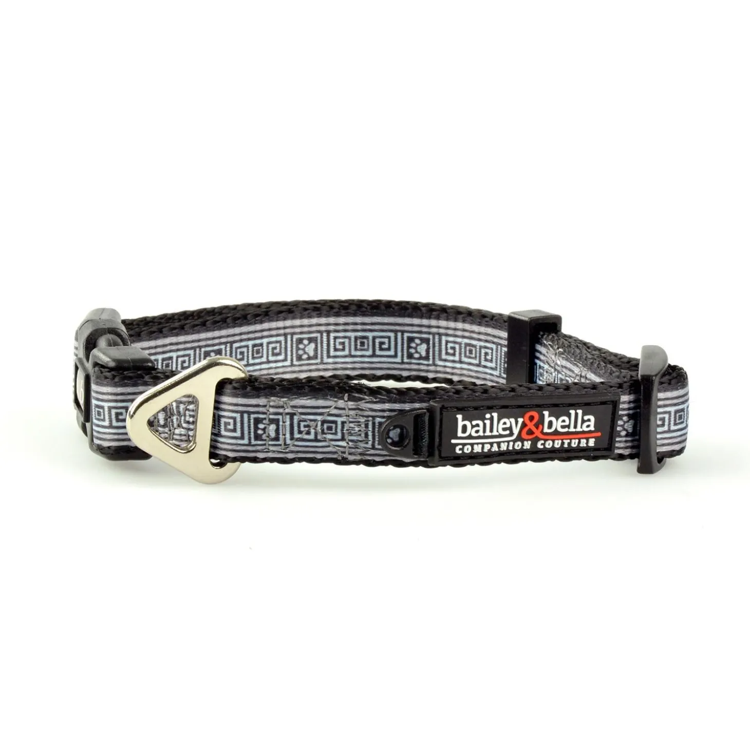 Bailey & Bella Adjustable Grey Squares Dog Collar is made with a durable plastic buckle, plastic slip locks and metal D-ring.