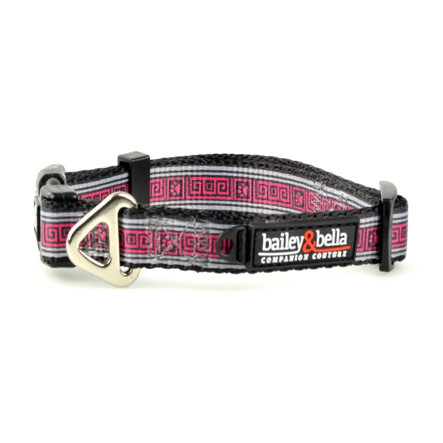 Bailey & Bella Adjustable Pink Squares Dog Collar is made with a durable plastic buckle, plastic slip locks and metal D-ring.
