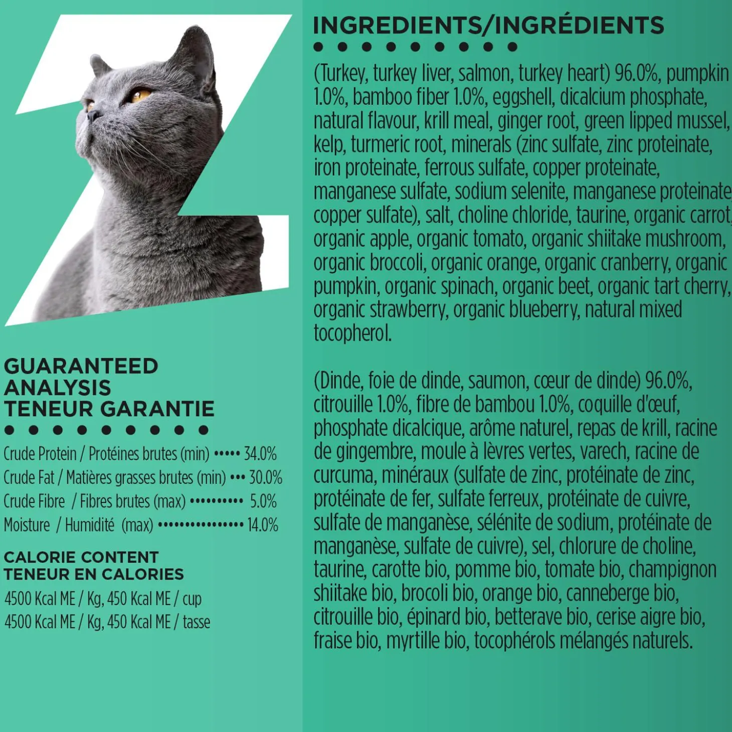 Zeal Air-Dried Salmon & Turkey Recipe Cat Food is a complete and balanced wholesome diet for cats, made with 96% locally sourced turkey and salmon. Zeal combines the finest meats and premium ingredients, then use the traditional method of natural air drying to preserve all the nutrients and flavours. This artisanal technique naturally evaporates the moisture by gently circulating air, thus reducing its volume while concentrating the nutrition. All without sacrificing the taste cats love! Zeal provides all the benefits of raw food without any of the hassles. Cats can’t get enough of this jerky-like food and are sure to be thrilled by every meal!