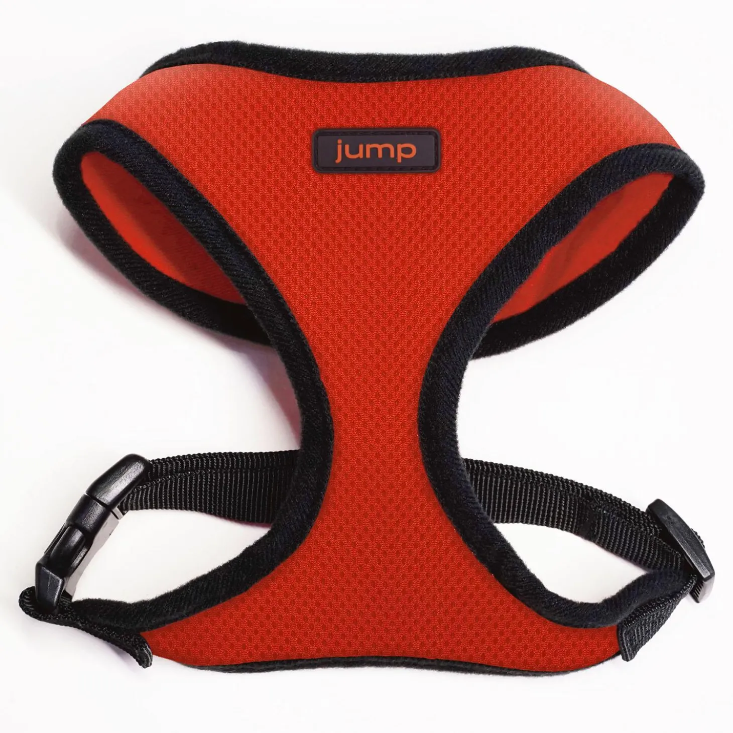 JUMP! Air Mesh Over-the-Head Orange Dog Harness slips easily over a dog’s head, around their waist, and clips at the side. It is lightweight for added comfort and reduced risk of skin irritation, and adjustable at the waist for a better fit. The air mesh provides comfort and breathability for increased airflow to keep dogs cooler in hot weather. D-ring on the back of the harness for leash attachment. This harness is suitable for light pullers. Not suitable for use with a tie-out.