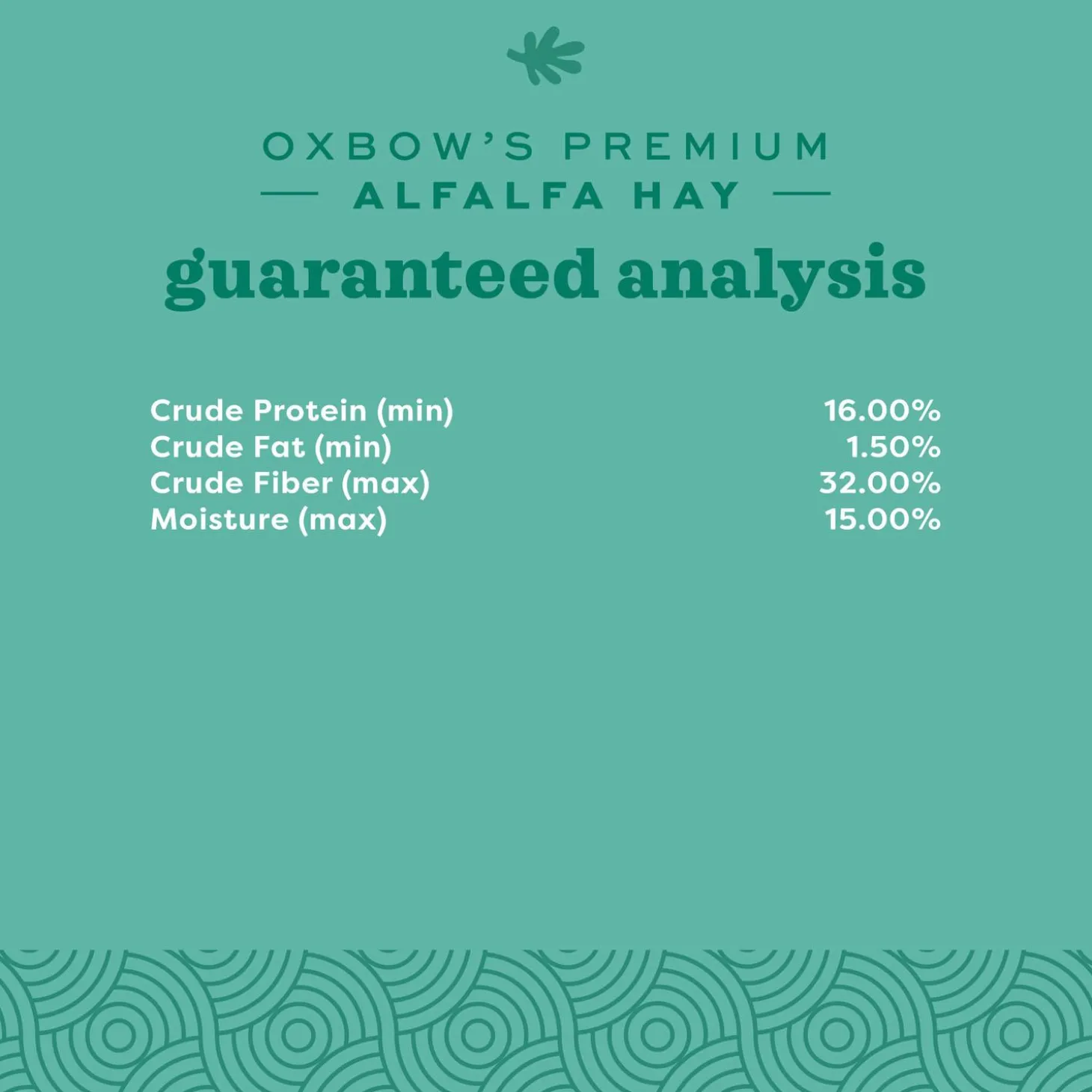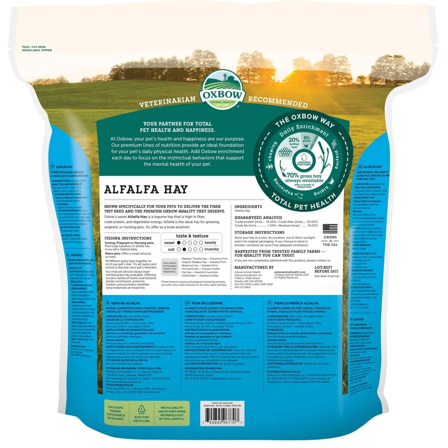 Oxbow Alfalfa Hay is a sweet, soft legume hay that is high in fibre, protein, and digestible energy. Alfalfa hay is the ideal hay for growing, pregnant, or nursing pets. Or, as a treat for your rabbit, chinchilla, guinea pig or other small pet anytime.