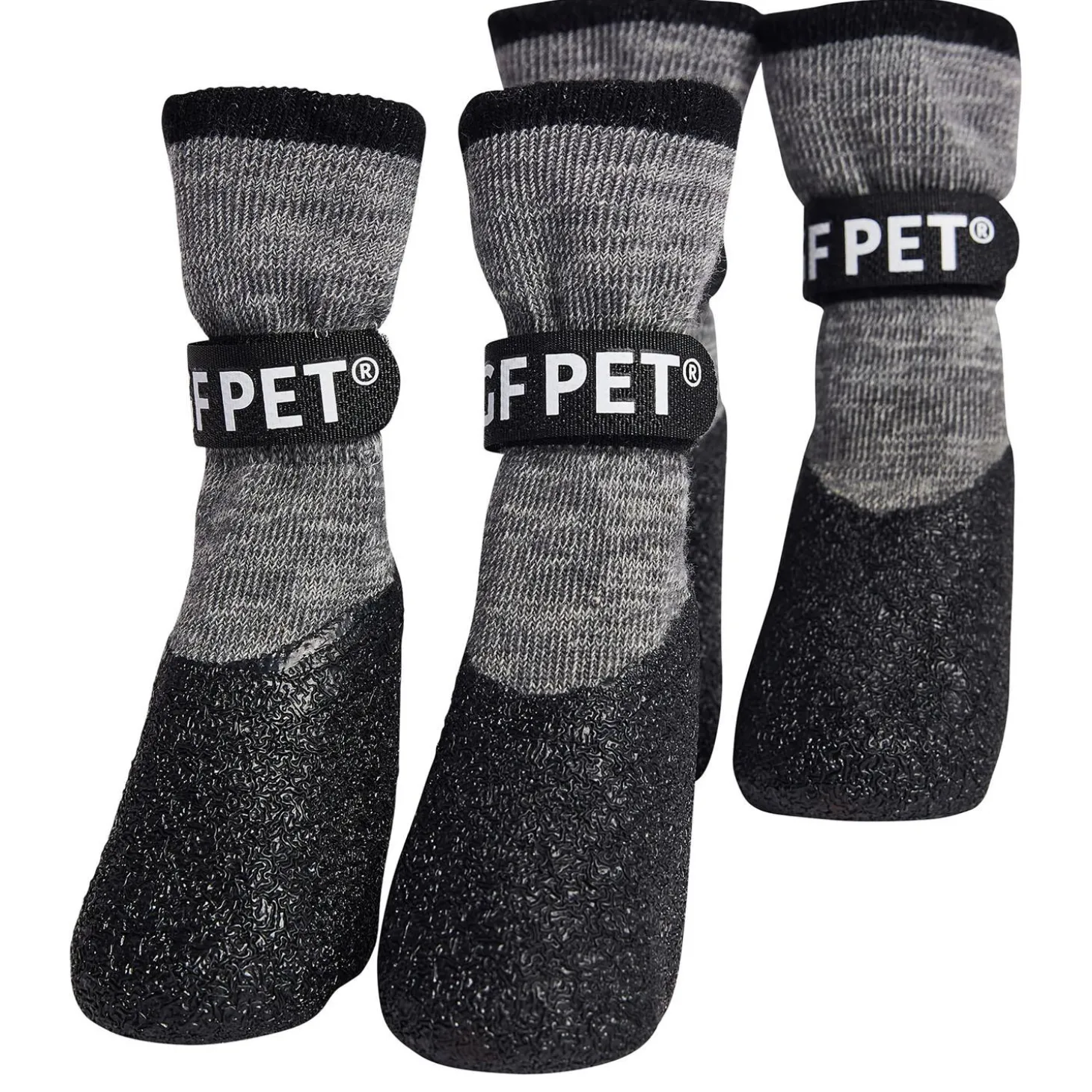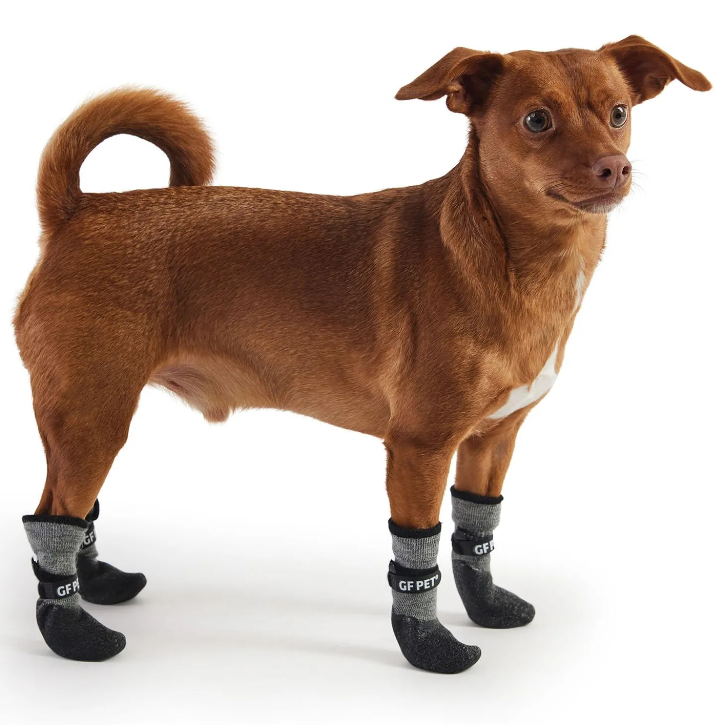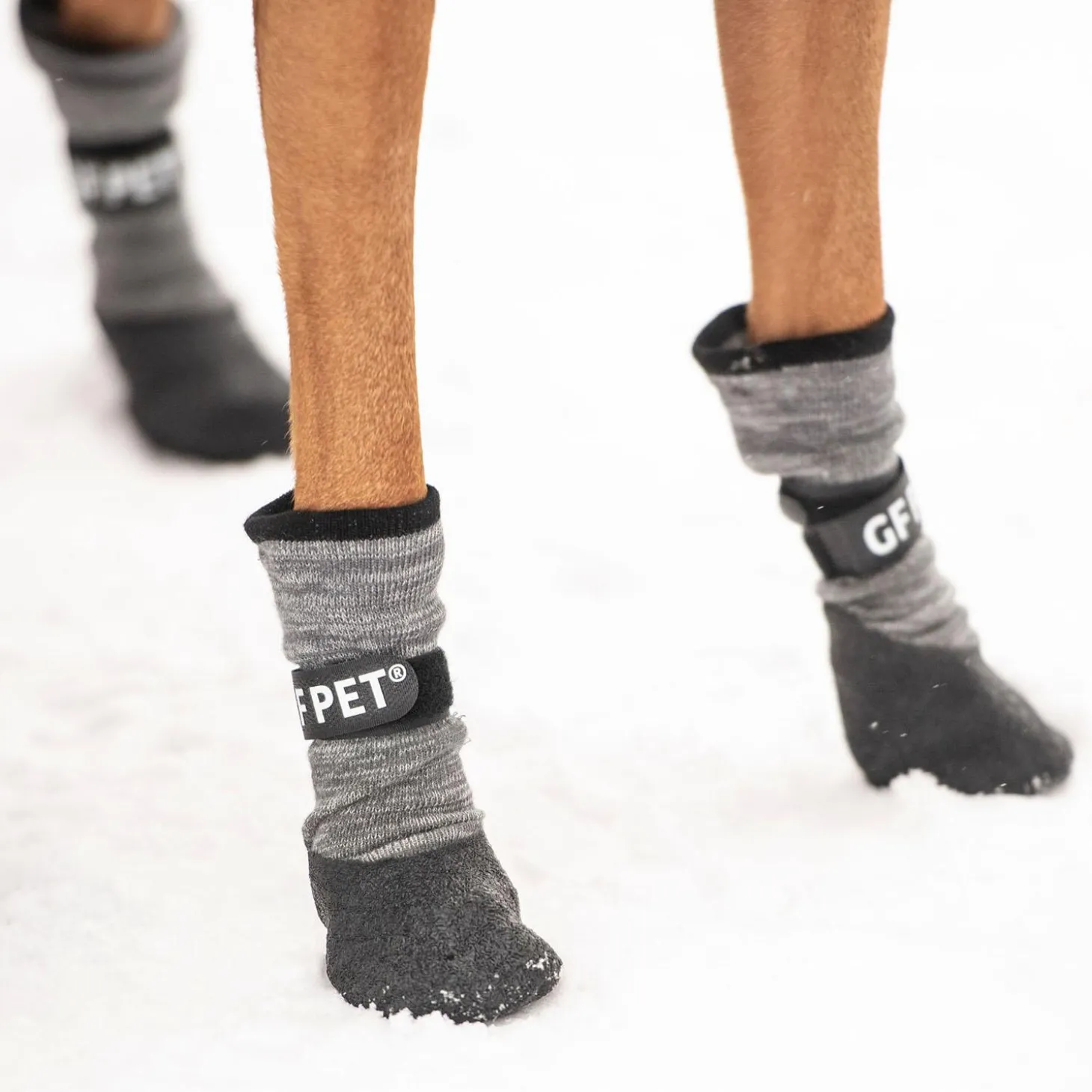 GF Pet All Terrain Boots fit easy like a sock! These are ideal for any season to protect paws from snow, ice, rain or hot pavement. A warm sock is integrated into the lightweight waterproof boot with a flexible, high, ultra-grip, durable sole. Secure with an adjustable hook & loop fastener to hold the boot in place. An easy all-season solution! 2-in-1 sock in boot!