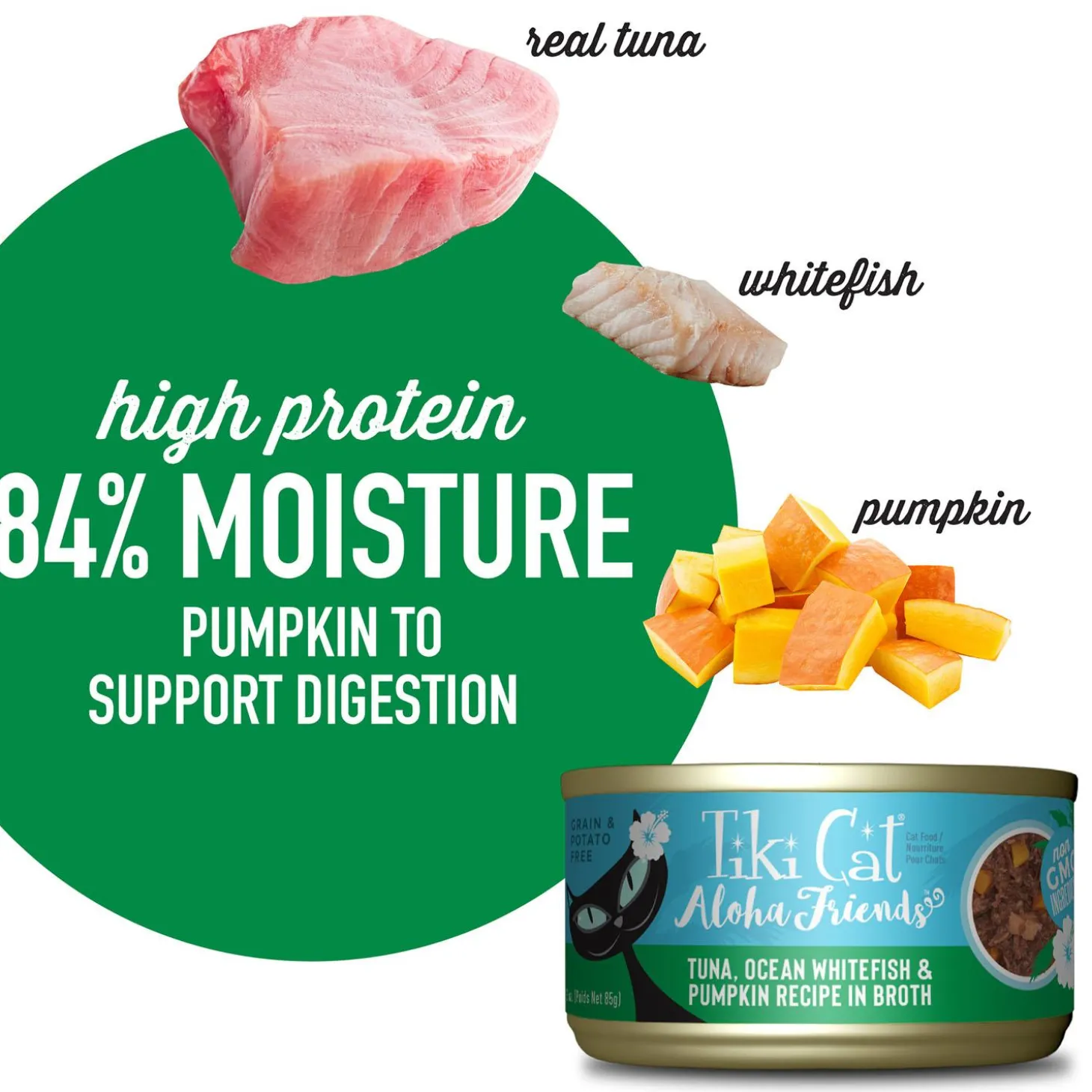 Tiki Cat Aloha Friends Tuna, Ocean Whitefish & Pumpkin Recipe in Broth Cat Food is a delicious meal made with real tuna and easy-to-digest pumpkin in a tempting tuna broth.