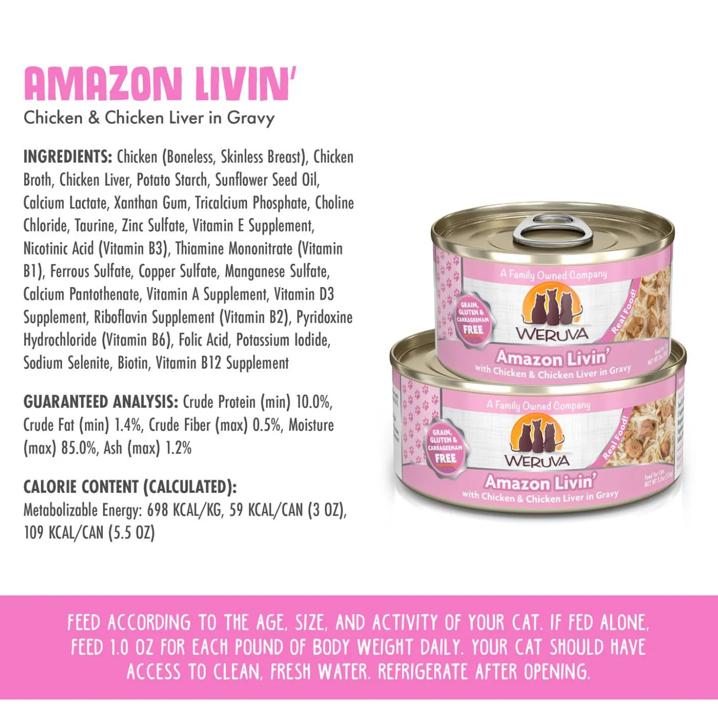 Weruva Amazon Livin’ with Chicken & Chicken Liver Adult Cat Food takes mealtime up a notch with white breast meat chicken paired with chicken liver in a flavourful gravy. Made from seriously good ingredients you can see, this classic recipe is crafted to please your obligate carnivore at every meal.