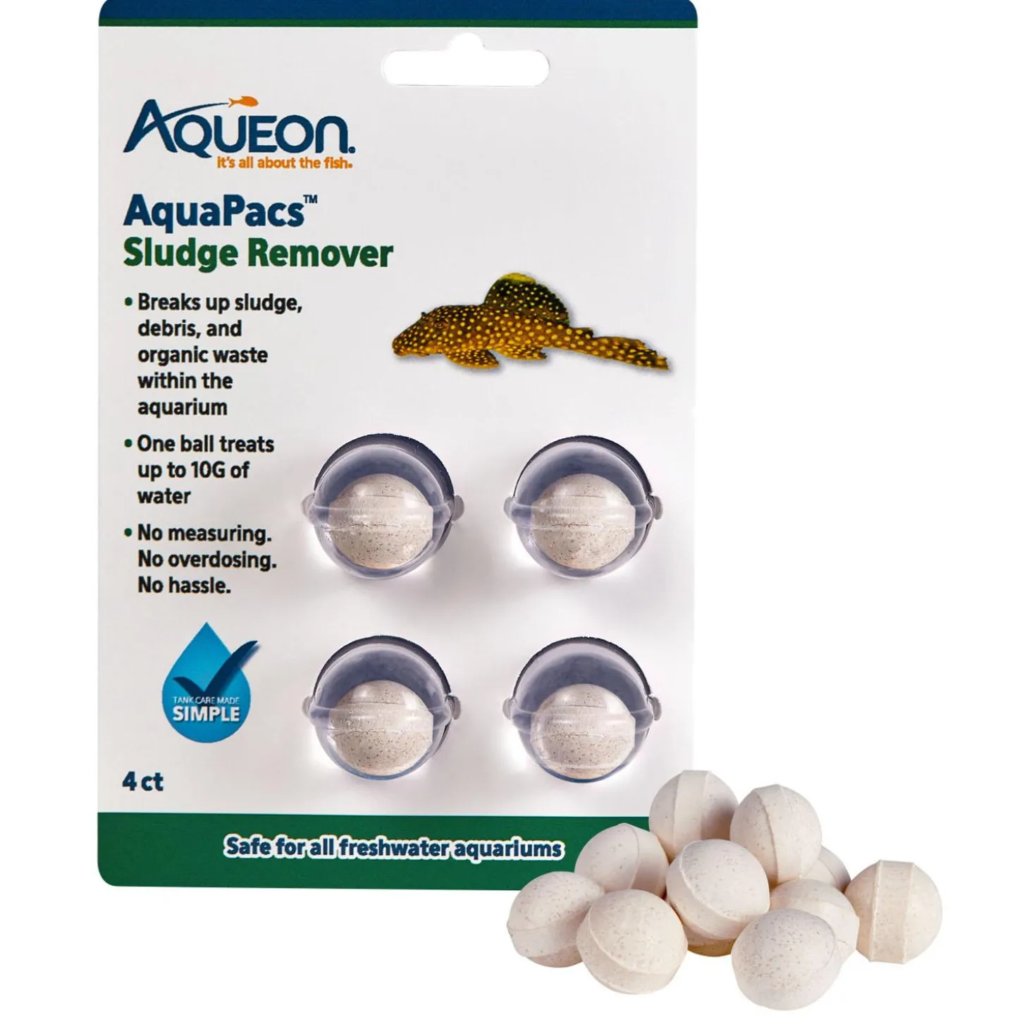 Aqueon AquaPacs Sludge Remover helps keep your fish tank pristine. These convenient balls effectively break down sludge, debris, and organic waste, converting them into harmless byproducts that can easily be removed through filtration, water changes, or gravel vacuuming. With a measureless formula, AquaPacs Sludge Remover is safe and easy to use, treating up to ten gallons of water per ball with no risk of overdosing. Spend less time on aquarium maintenance and enjoy cleaner water and a healthier environment for your fish with AquaPacs Sludge Remover.