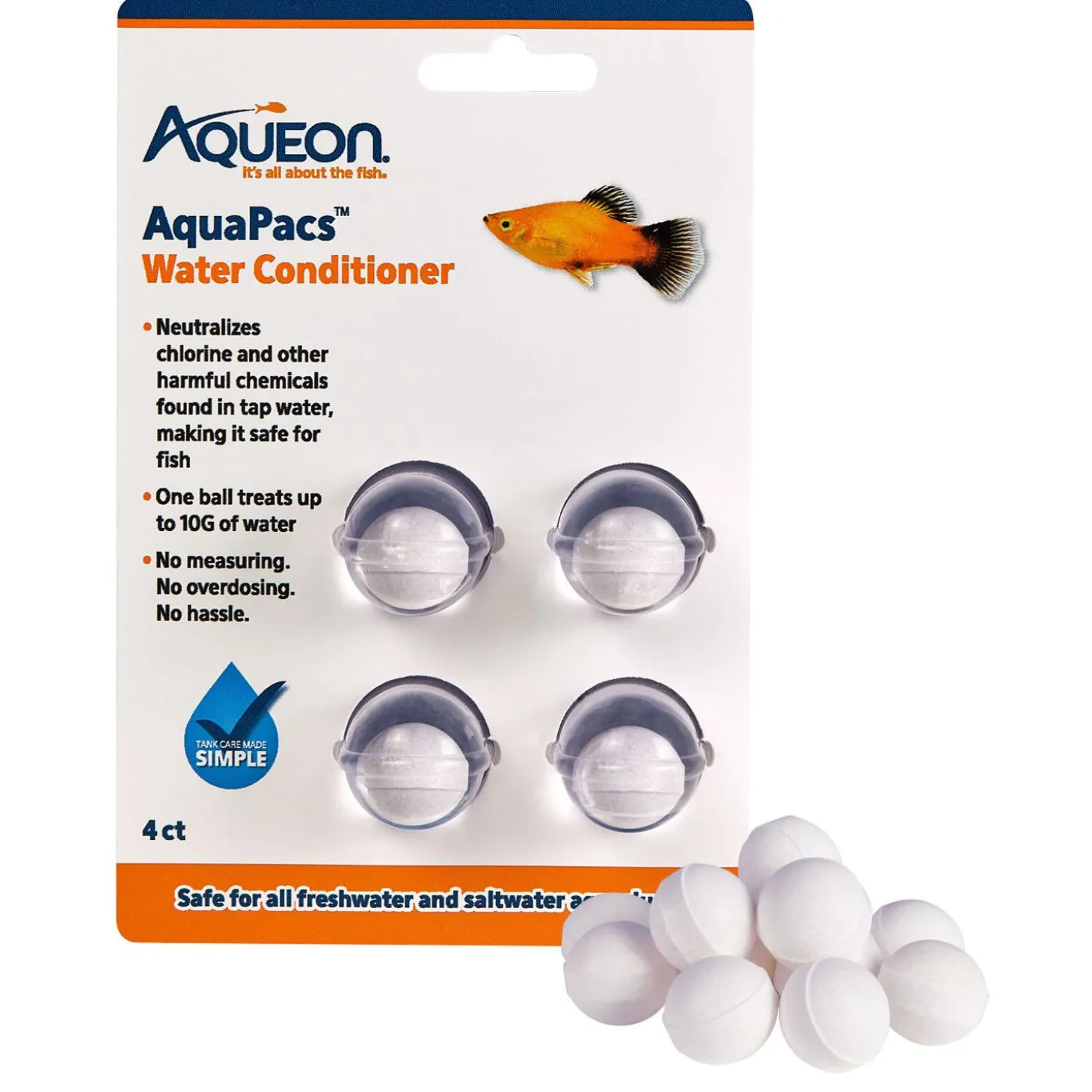 Aqueon AquaPacs Water Conditioner protects your fish from the harmful effects of chlorine. When setting up a new aquarium or adding fresh water during water changes, it’s crucial to neutralize any chlorine present in the tap water. Failure to do so can have serious consequences for your aquatic pets. With Aqueon’s AquaPacs Water Conditioner, you can easily maintain the health and happiness of your fish. This hassle-free water conditioner does not need to be measured out like a liquid water conditioner does and it cannot be overdosed. Each ball treats up to 37.8L (10 gal) of water, making it ideal for new water additions and regular water changes to ensure a well-balanced aquatic environment. Spend less time worrying about water care and more time enjoying your fish with AquaPacs Water Conditioner.
