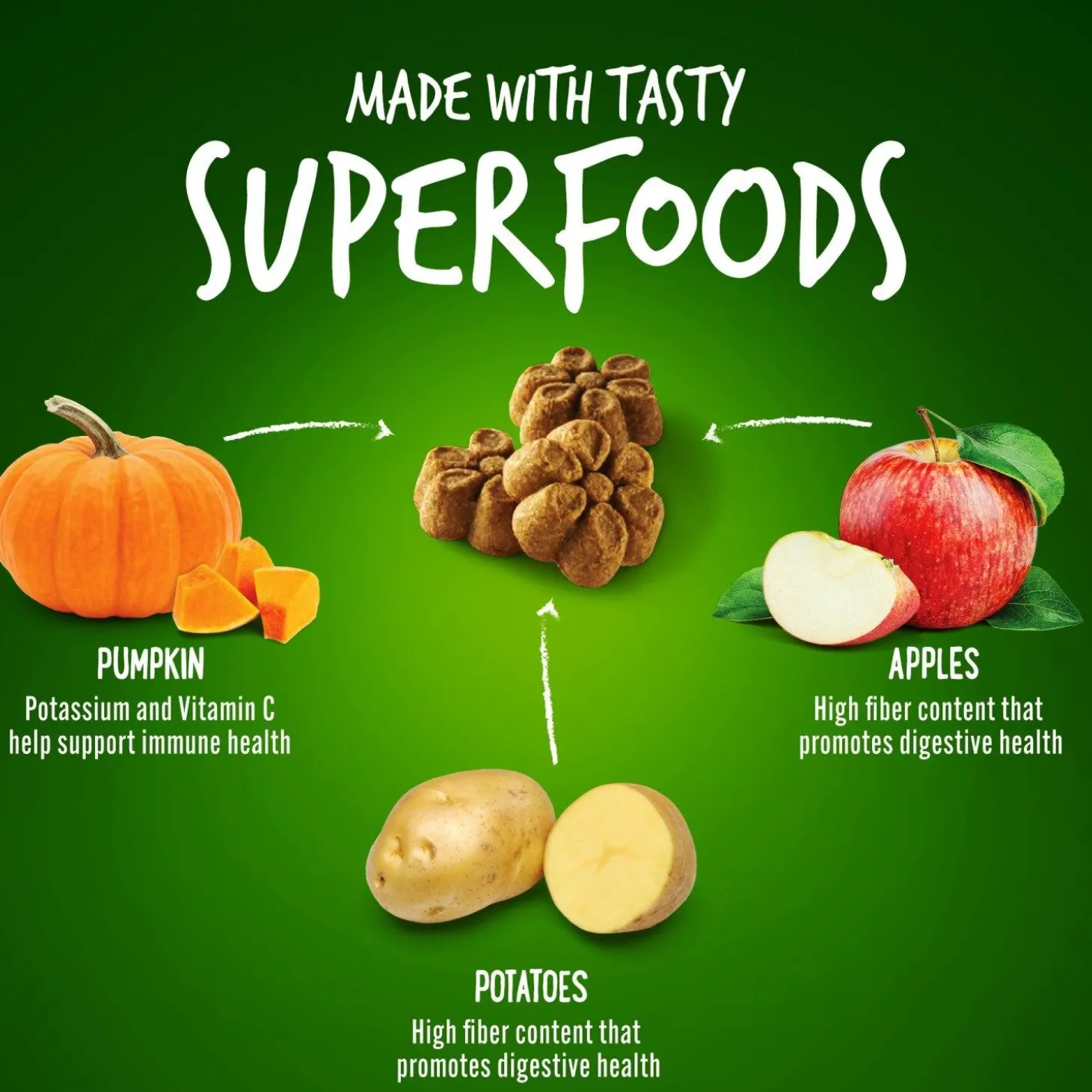 The comfort of home! This baked apple-inspired recipe combines fresh pumpkin, sweet apples and a touch of cinnamon into a delicious bite that’s sure to delight. Open a bag today and smell the Fruitables Baked Pumpkin & Apple Flavour Dog Treats difference!