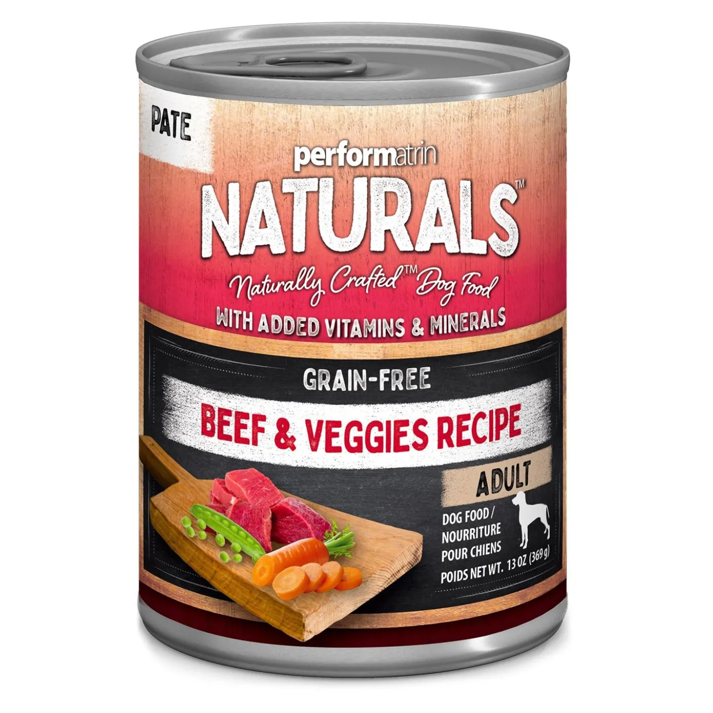 Performatrin NATURALS Beef & Veggies Grain-Free Recipe Pate Adult Dog Food is a delicious recipe where high-quality protein is always the first ingredient. Naturally Crafted, from our family to yours because mealtime is family time, and our pets are family.