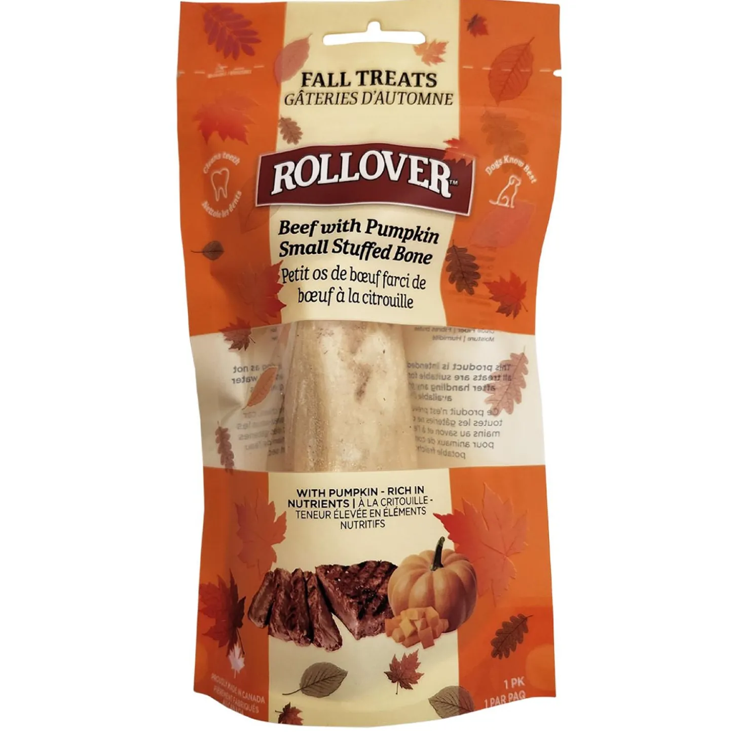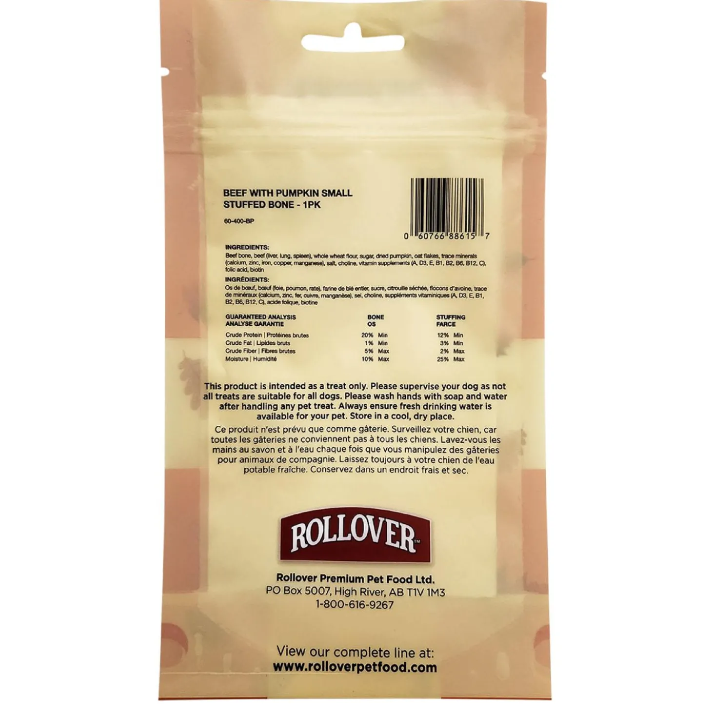 Rollover Beef with Pumpkin Small Stuffed Bone Dog Treat is a natural, cleaned beef bone filled with Rollover’s delicious seasonal Beef with Pumpkin filling. It is carefully baked for a dog’s chewing enjoyment. Rollover bones are a good way to satisfy the natural urge to chew, while helping to clean teeth! This tasty filling has the added benefits of pumpkin (a proven aid to digestion, can help to ease an upset stomach, rich in nutrients and can help to boost the immune system).