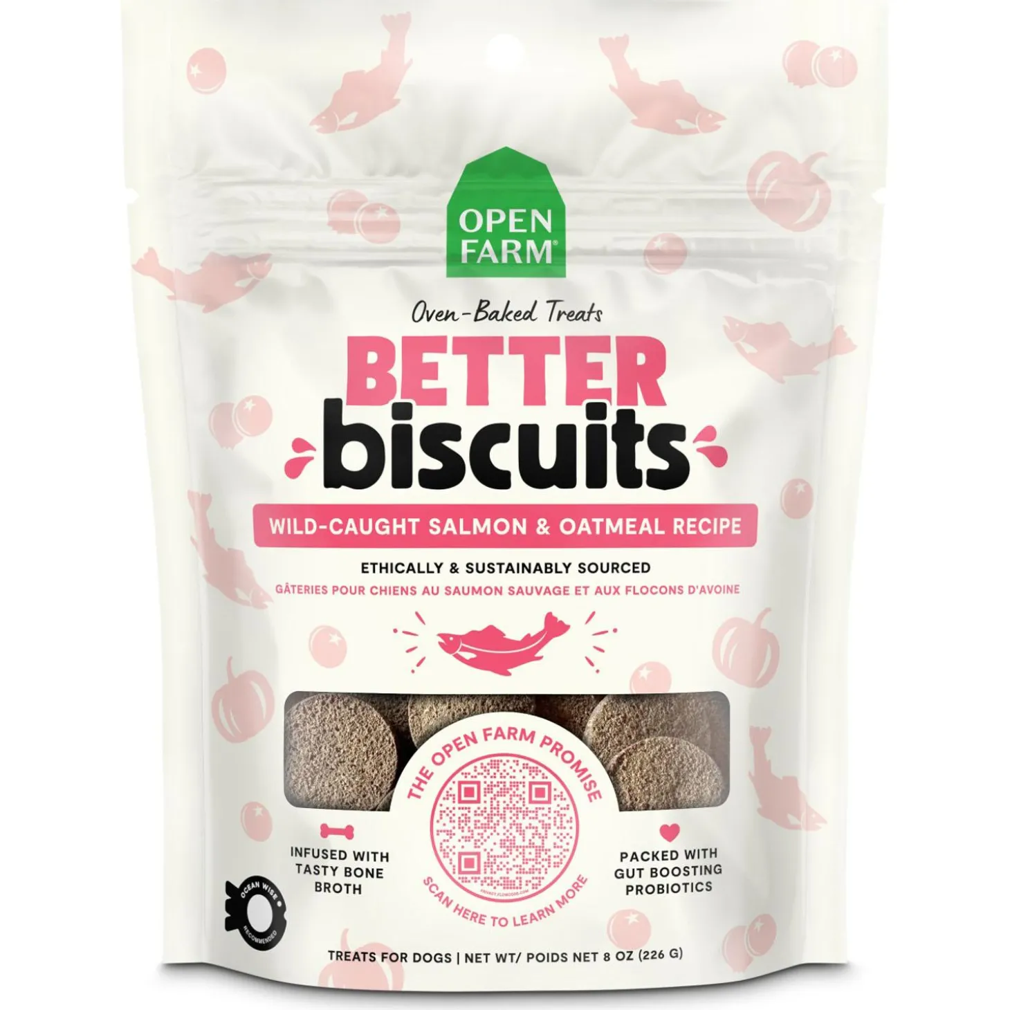 Open Farm Better Biscuits Wild-Caught Salmon & Oatmeal Recipe Dog Treats are made with Ocean Wise certified salmon as the first ingredient and are combined with superfoods like pumpkin & sweet potato to deliver a crave-worthy taste. These treats are gently oven-baked for a crunchy treat, packed with probiotics to support a healthy gut, and infused with bone broth to support healthy digestion, making them a perfect reward for your pup!