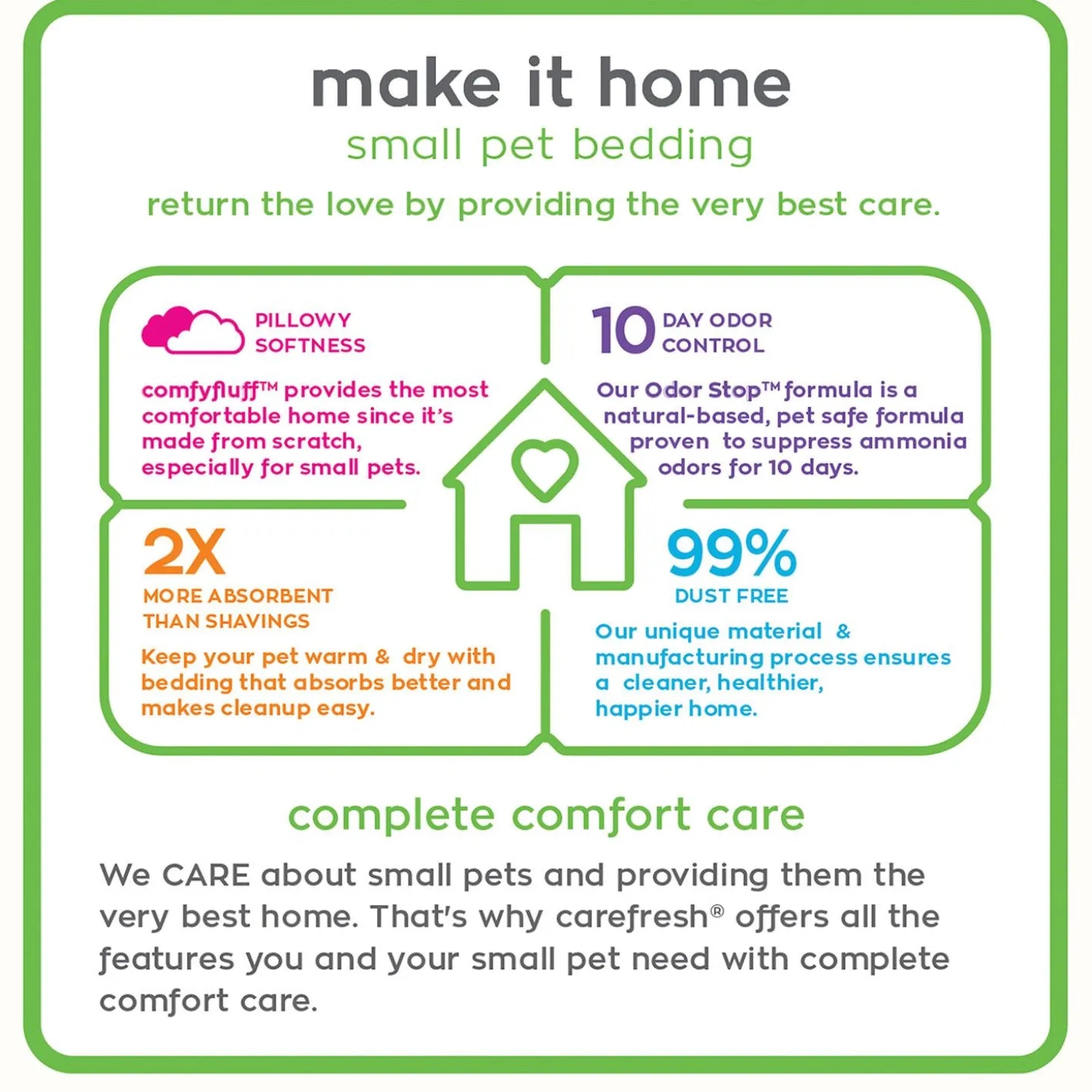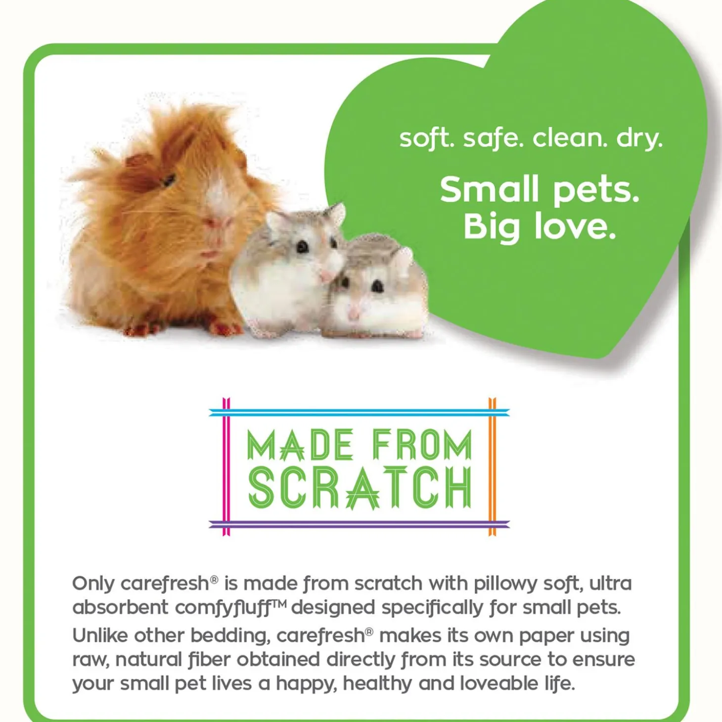 Only carefresh is made from scratch with pillowy soft, ultra absorbent comfyfluff designed specifically for small pets. Provide your small pet with a soft, safe, clean, dry home derived from 100% reclaimed natural fiber. Perfect for hamsters, gerbils, rats, mice, rabbits, guinea pigs, chinchillas, ferrets.