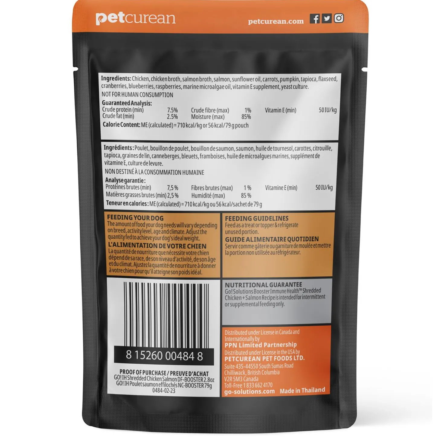Go! Solutions Booster Immune Health Shredded Chicken + Salmon Recipe in Broth Dog Food Topper will add variety + immune support to your best friend’s bowl. Loaded with postbiotics + antioxidants from Vitamin E and fruits including cranberries, blueberries, and raspberries to support a healthy immune system, our Immune Health dog food topper is a great (and oh-so tasty) way to help maintain everyday immunity.