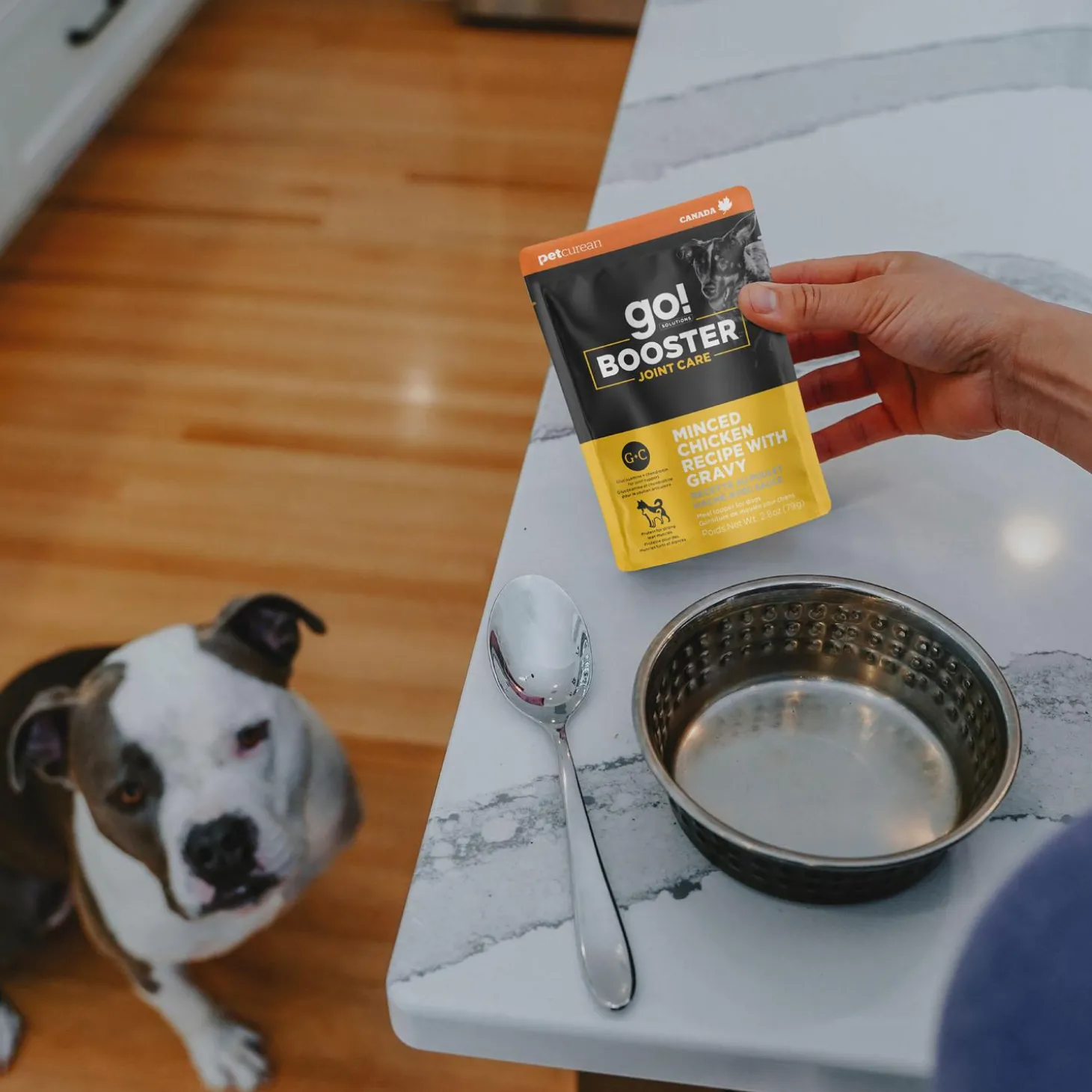 Go! Solutions Booster Joint Care Minced Chicken Recipe With Gravy Dog Food Topper is proof that dogs never outgrow gravy. Show your canine extra care with an irresistible meal topper that helps maintain joints and supports muscle strength. This food is made with protein-rich chicken and glucosamine + chondroitin to support healthy muscles, strong joints and keep your best friend moving. Rich in flavour + functional ingredients, this is an ideal dog food topper for your mature pal.
