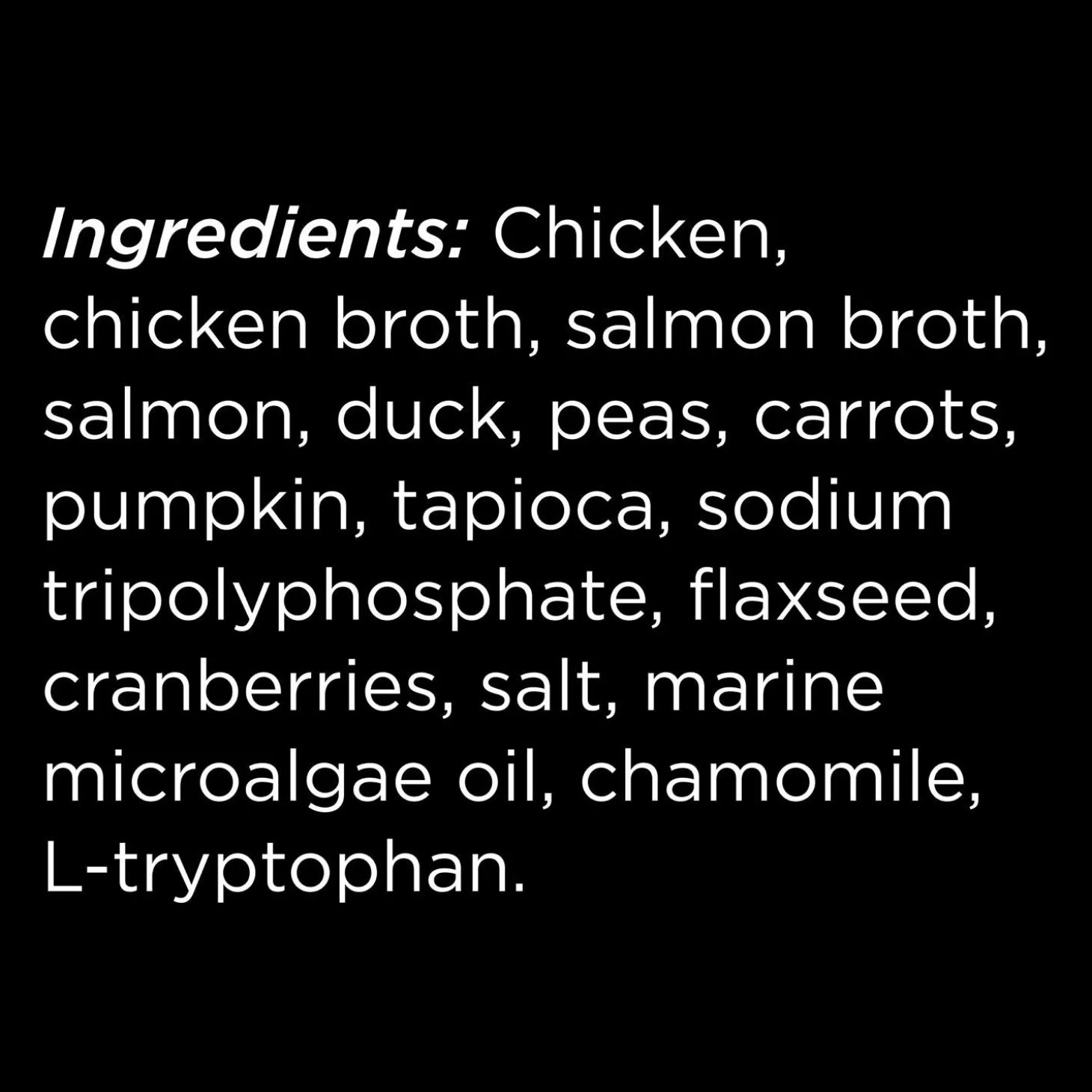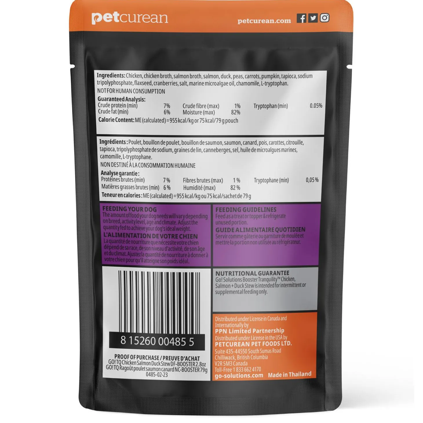 Go! Solutions Booster Tranquility Chicken, Salmon + Duck Stew Dog Food Topper is for Tranquility and is specially crafted with ingredients like L-tryptophan to support serotonin production and a happy mood. Dogs can experience stress and anxiety just like you. Rich in delicious chicken, salmon and duck and expertly blended with fruit, veggies, and chamomile, the appetizing flavour of the Tranquility Boosters is a great way to add a tasty bright spot to your dog’s day.