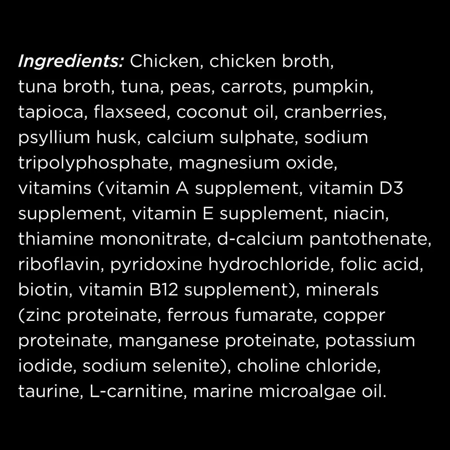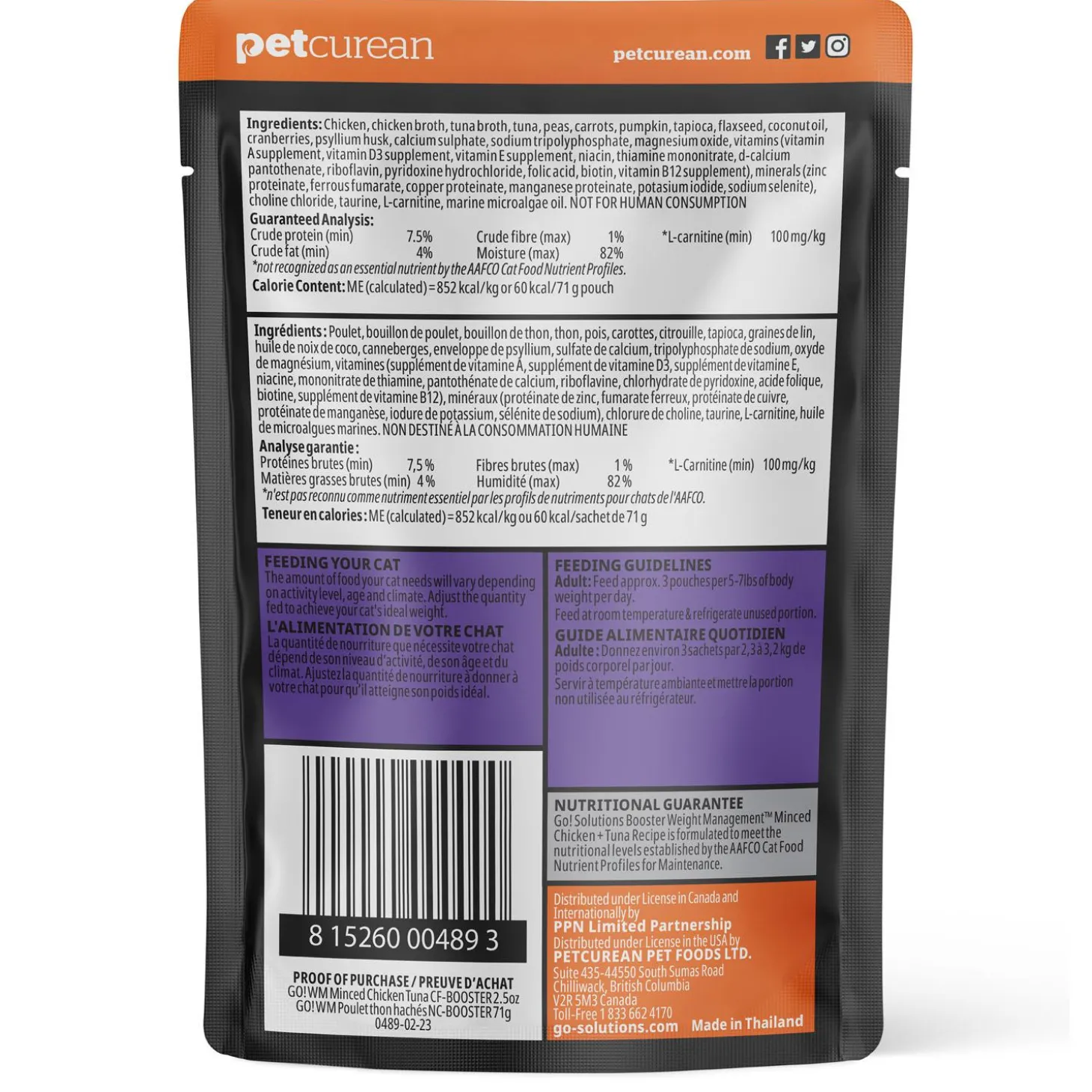 Go! Solutions Booster Weight Management Minced Chicken + Tuna Recipe With Gravy Adult Cat Food Topper is a great way to help manage your mature cat’s weight which doesn’t involve foregoing flavour and nutrition. Go! Solutions Booster Weight Management Minced Chicken + Tuna Recipe Adult Cat Food Topper combines lean proteins with fibre-rich psyllium husk and veggies to keep your cat feeling full. With L-carnitine to support healthy metabolism and help burn cat fat into active energy, this complete and balanced weight control recipe makes for a functional stand-alone meal or a tasty topper.