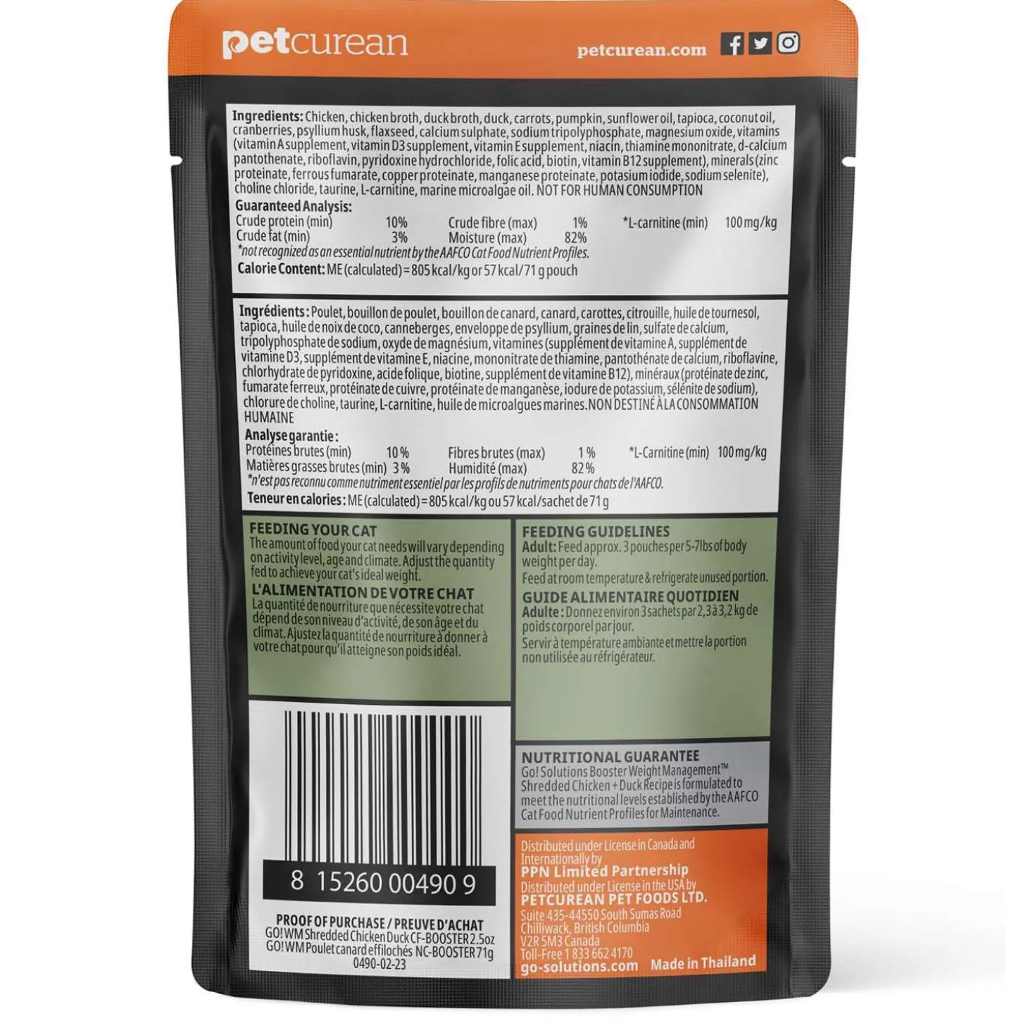 Go! Solutions Booster Weight Management Shredded Chicken + Duck Recipe in Broth Adult Cat Food Topper combines lean proteins with fibre-rich psyllium husk and veggies to keep your kitty feeling full. Managing your mature cat’s weight doesn’t mean foregoing flavour and nutrition. With L-carnitine to support healthy metabolism and help burn cat fat into active energy, this complete and balanced weight control recipe makes for a functional stand-alone meal or a tasty topper.