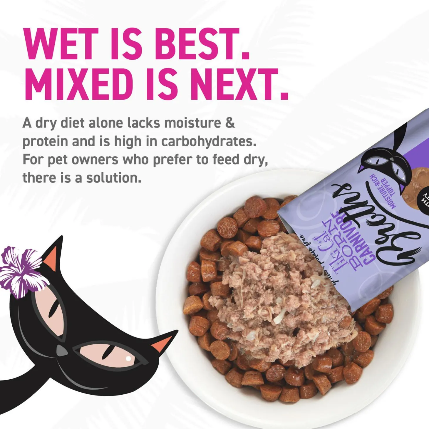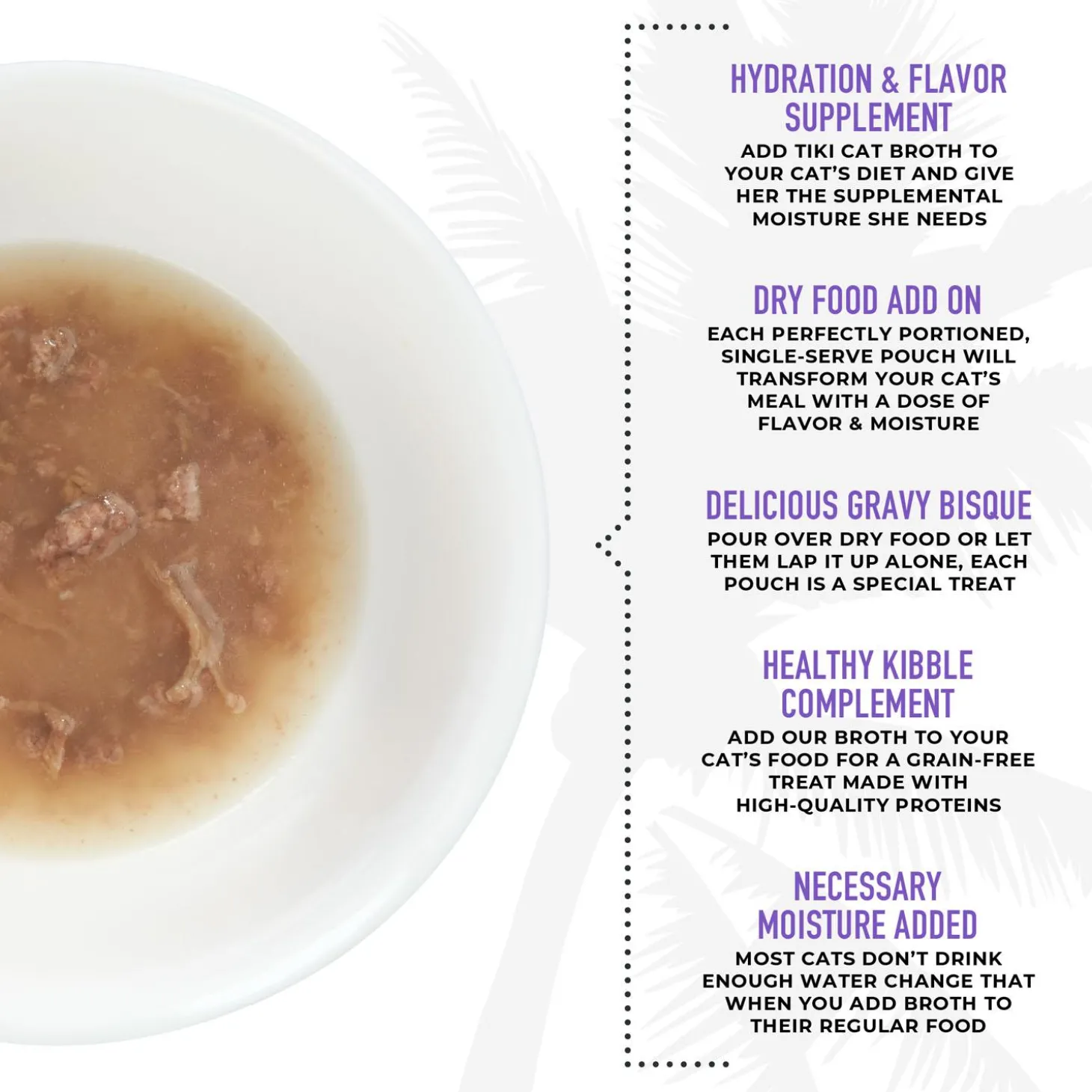 Tiki Cat Born Carnivore Broths Duck & Chicken Cat Food Topper is the perfect addition to your felines meals because cats crave and require added moisture in their diets. Each perfectly portioned single-serve pouch can transform your cat’s typical meal with a dose of flavour or let them lap it up alone as a special treat. Made with everything cats need and nothing they don’t.