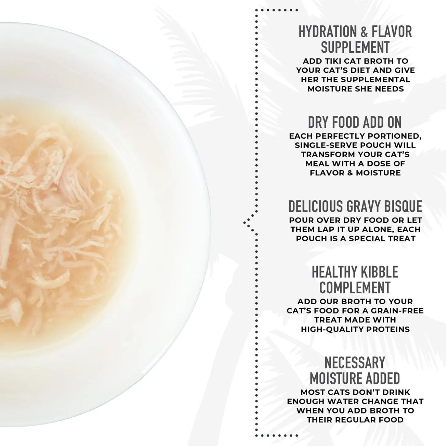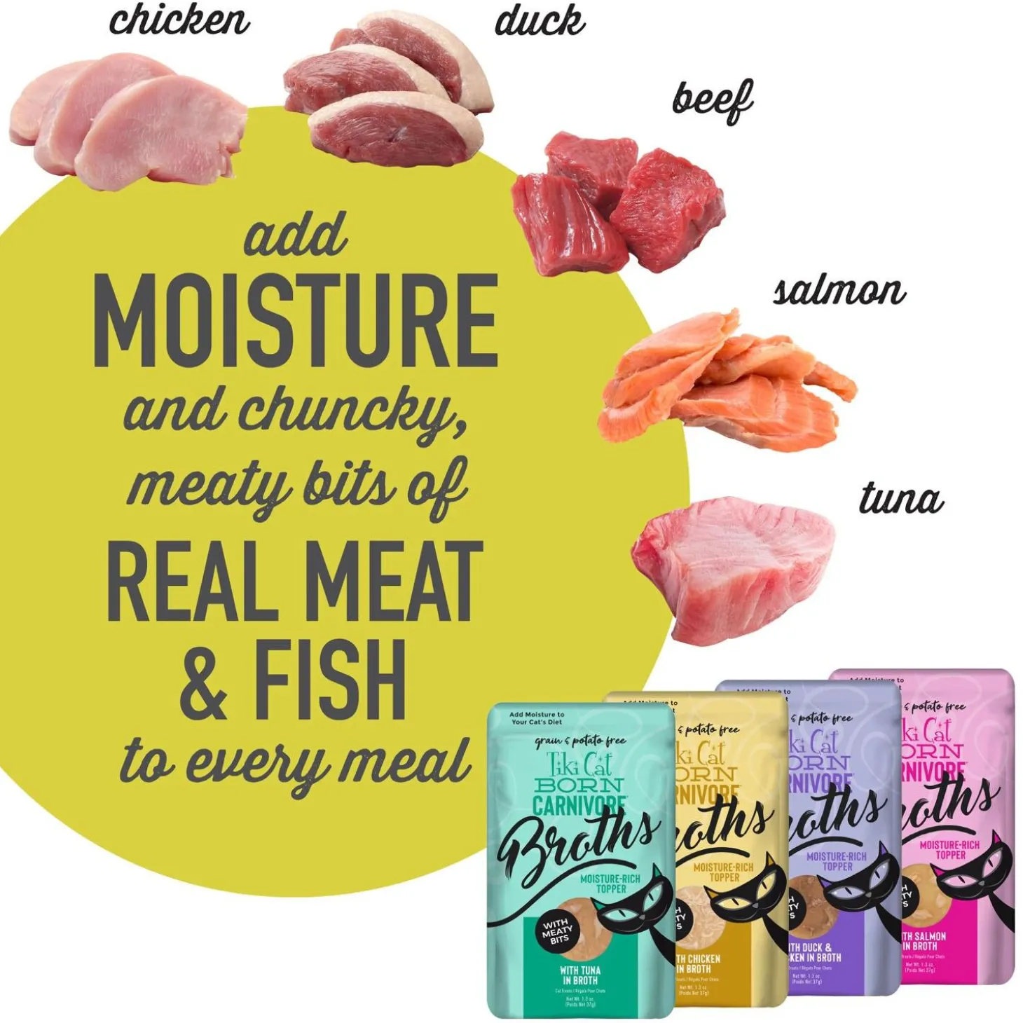Tiki Cat Born Carnivore Broths Variety Pack Cat Food Topper is made with real ingredients that cats need and nothing they don’t. Cats crave – and require – added moisture in their diets. Each perfectly portioned Tiki Cat Born Carnivore Broths pouch can transform your cat’s typical meal with a dose of flavour, or let them lap it up alone as a special treat.
