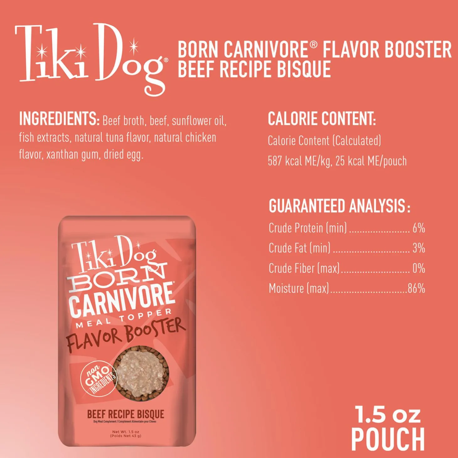 - Tiki Dog Born Carnivore Flavour Boosters offers a decadent gravy with small chunks of protein for a luxurious meal topper or treat for supplemental nutrition for your dog