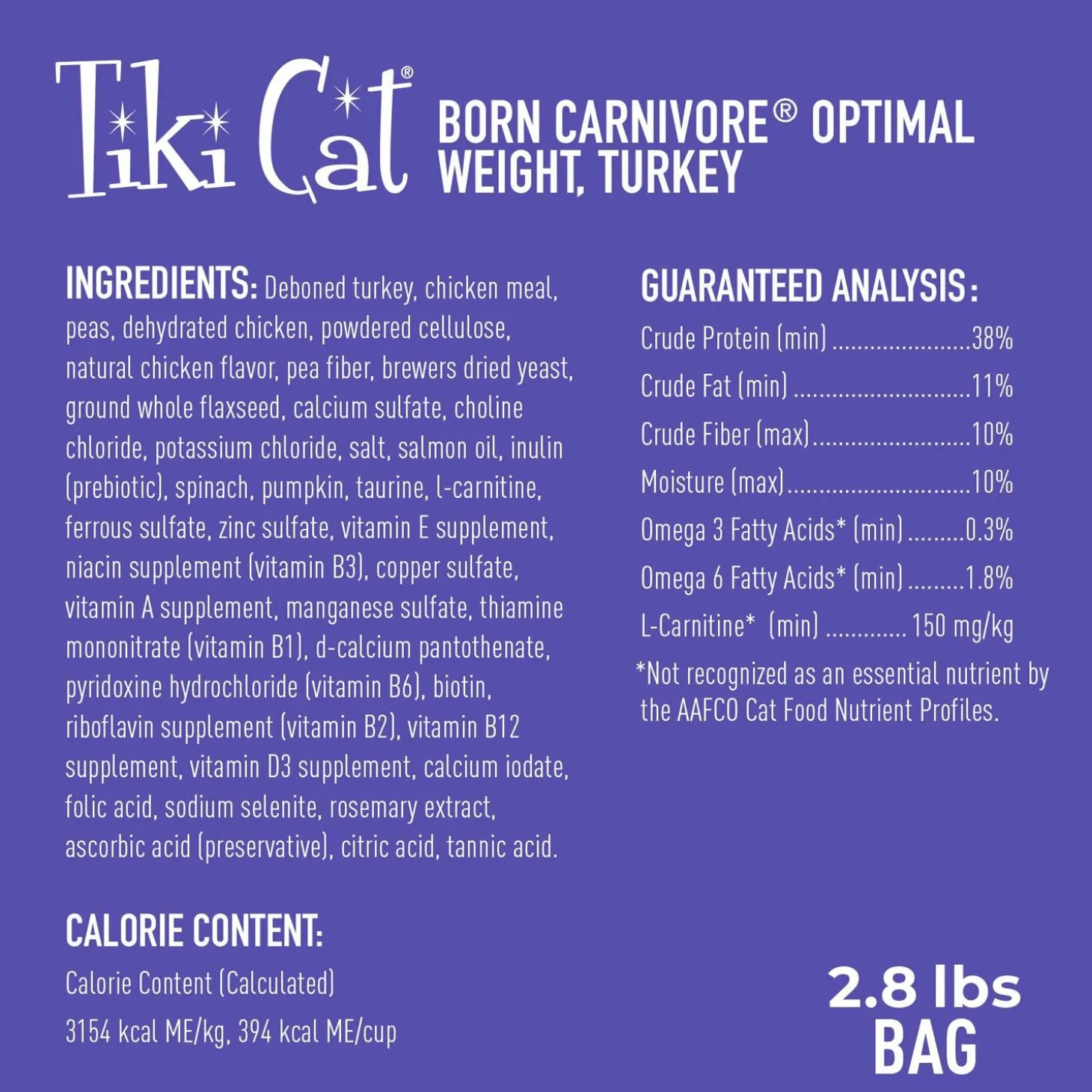 Tiki Cat Born Carnivore Optimal Weight Turkey Recipe Adult Cat Food is oven-baked, minimally processed and protein-rich, with real turkey and chicken in a low-calorie formula to support a healthy weight. Potato and grain-free, plus omega fatty acid sources for beautiful skin and coat. No animal by-products, corn, wheat or soy, and no artificial flavours or colours.