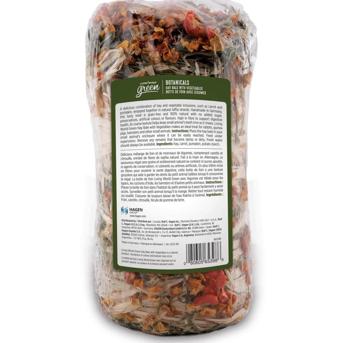 Living World Green Botanicals Hay Bale with Vegetables for Small Animals is a delicious combination of hay and vegetable inclusions, such as carrot and pumpkin, wrapped together in natural raffia strands. This tasty treat is grain-free and 100% natural with no added sugar, preservatives, artificial colours or flavours. High in fibre to support digestive health, its coarse texture helps keep small anima’s teeth trim as it chews. Hay is vital to a small herbivore’s health and well-being, and provides environmental enrichment by encouraging natural foraging behaviour.