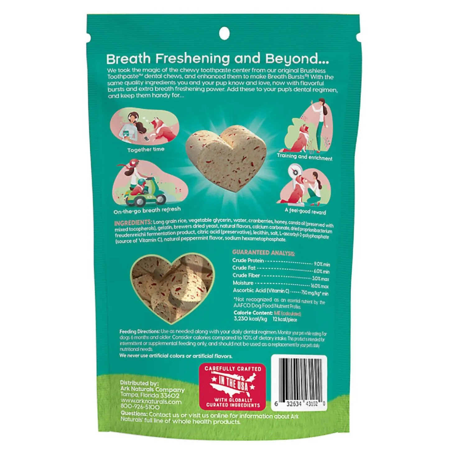 Ark Naturals Breath Bursts Brushless Toothpaste Peppermint Flavour Large Dog Treats burst bad breath’s bubble. Ark Naturals took the magic of the chewy toothpaste center and enhanced it with flavourful bursts and extra breath freshening power so that your pup can kiss bad breath goodbye. Ranked soft on the Denta-Meter, the unique texture of Breath Bursts also helps polish and clean teeth as your dog chews. That means that you can breathe a sigh of relief knowing they’ll have the freshest breath!