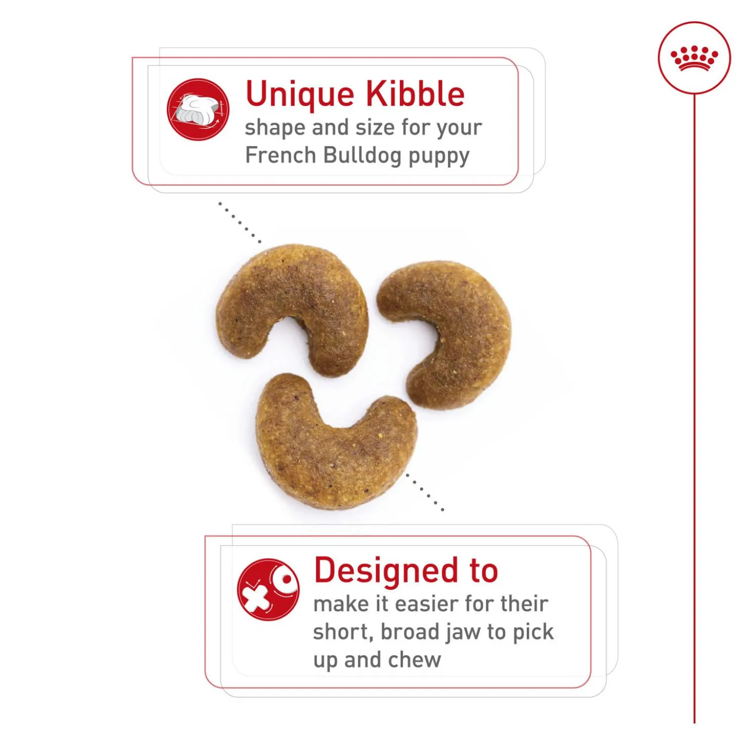 - Crunchy Kibble: Customized curved dog kibble shape specially designed for your French Bulldog puppy’s short muzzle and jaw shape.
