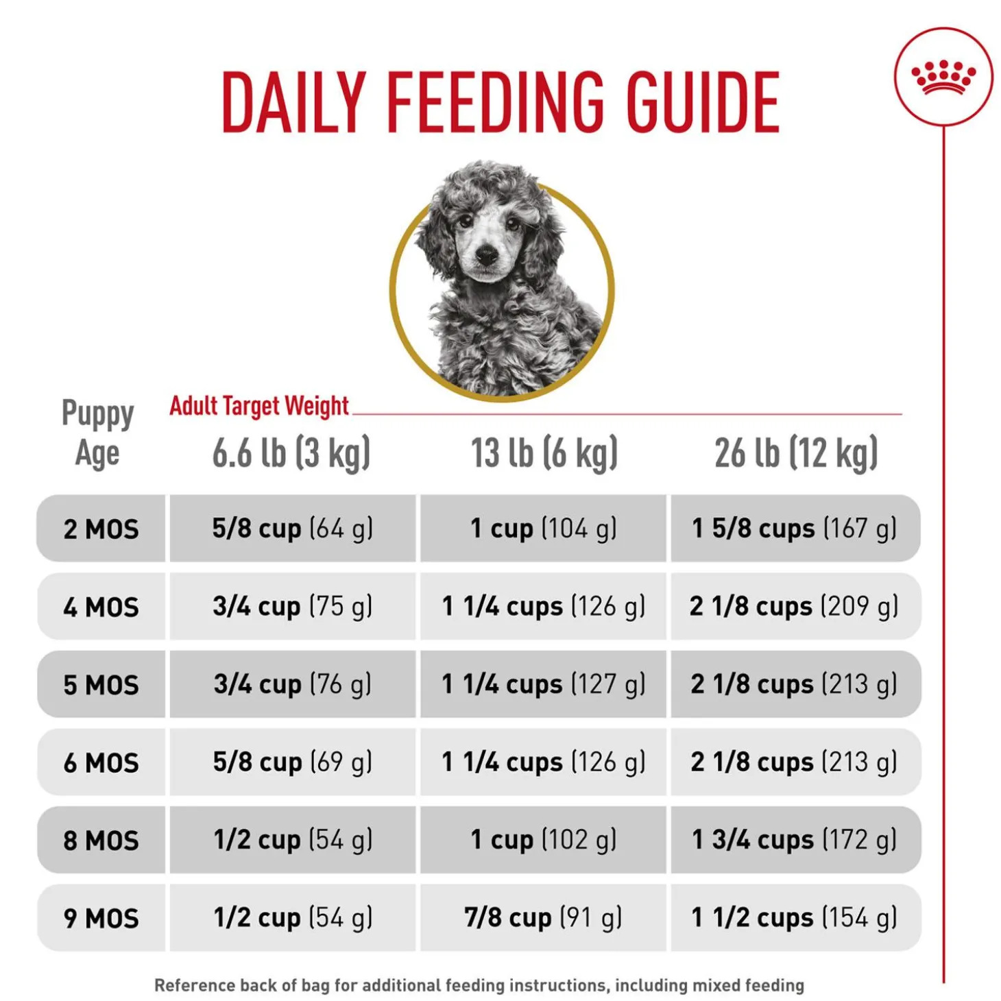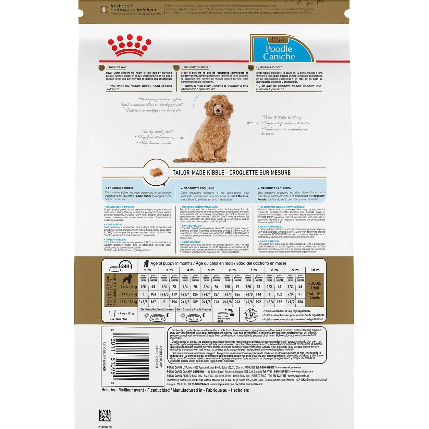 Royal Canin Breed Health Nutrition Poodle Puppy Dog Food supports optimal development of the immune system, delicate bones, skin and coat, and gastrointestinal system, while the customized kibble improves palatability and promotes chewing to support oral health. This recipe is designed exclusively for purebred Toy and Miniature Poodle puppies from 8 weeks to 10 months old.