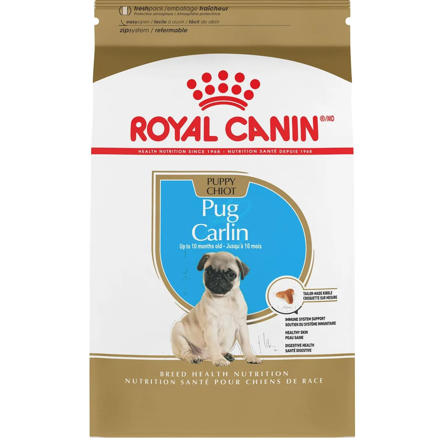 Royal Canin Breed Health Nutrition Pug Puppy Dog Food is tailor-made nutrition created just for your purebred Pug puppy. This exclusive breed-specific diet is uniquely formulated for your Pug puppy, with the specific nutrients to help them thrive. The custom kibble is specially designed for your Pug’s short, square muzzle, making it easy for them to pick up and chew. An exclusive mix of antioxidants including vitamin E supports their developing immune systems and keeps their bodies growing strong. Essential nutrients like EPA and DHA from fish oil help nourish healthy skin and coat. With high-quality proteins and prebiotics promote healthy digestion and optimal stool quality. Once your Pug is over 10 months old, transition them to Royal Canin Pug Adult dog food for precise nutrition into the adult years.