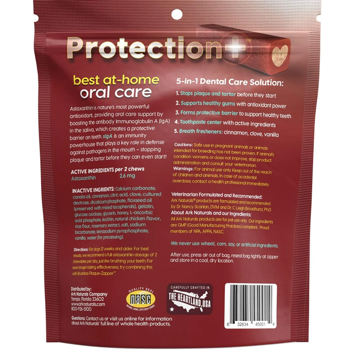 Ark Naturals Brushless Protection+ Dental Chew Small Breed Dog Treats stops plaque and tartar before they start and support healthy gums by forming a protective barrier on teeth. This unique process starts from the inside out, using astaxanthin’s powerful antioxidants to increase protective antibodies in the saliva. Once your pup chews through that antioxidant rich outside layer, they get to the toothpaste center that cleans and polishes.
