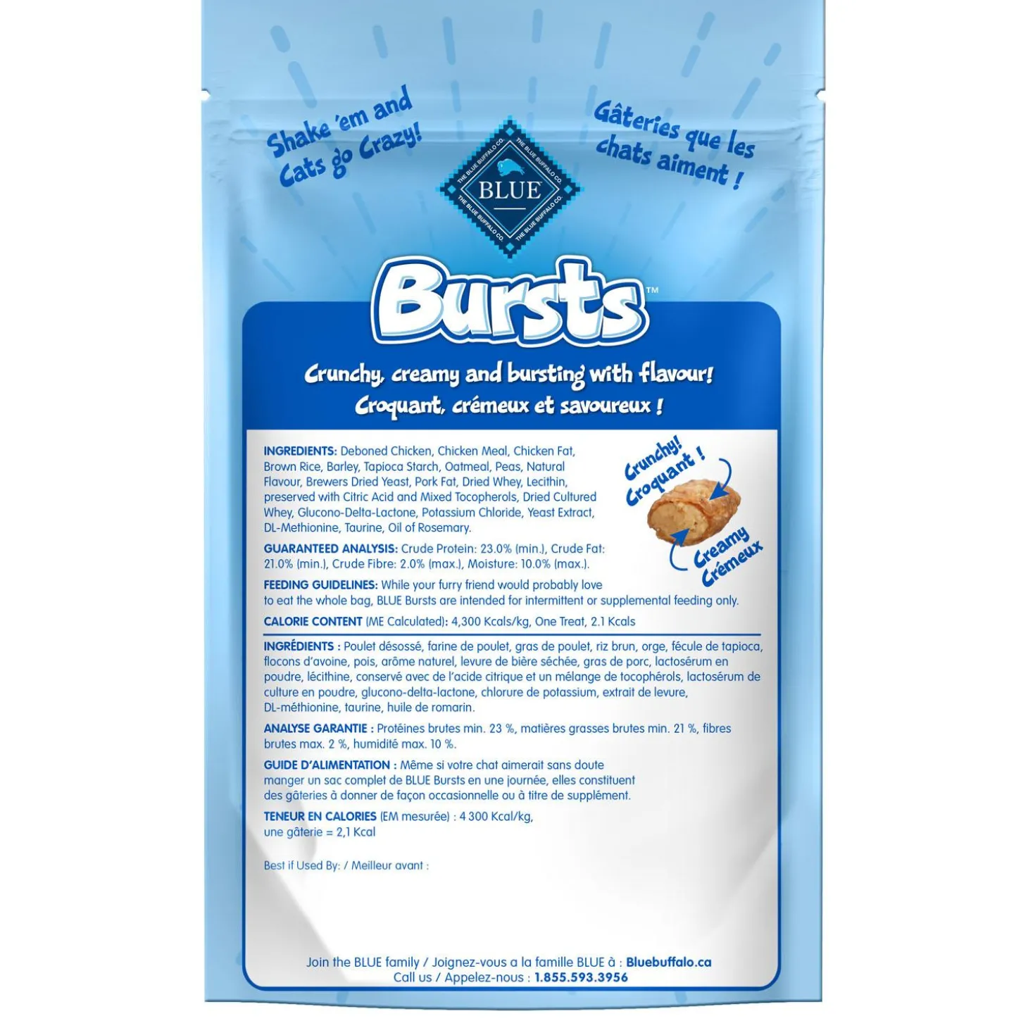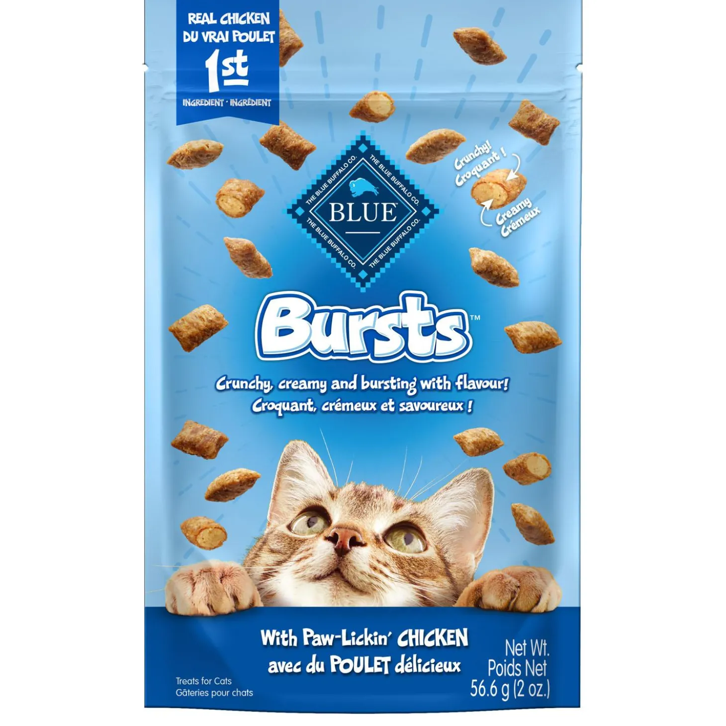 BLUE Bursts Paw-Lickin’ Chicken Cat Treats are a perfect snack for your feline friend. With a crunchy outer shell and a creamy center of mouth-watering chicken, these deliriously delicious cat treats are made to keep your kitty purring for more. Just shake the bag and cats come running! Made with real chicken first and NO poultry by-product meals, these cat treats feature the ingredients you’ll feel good about giving.