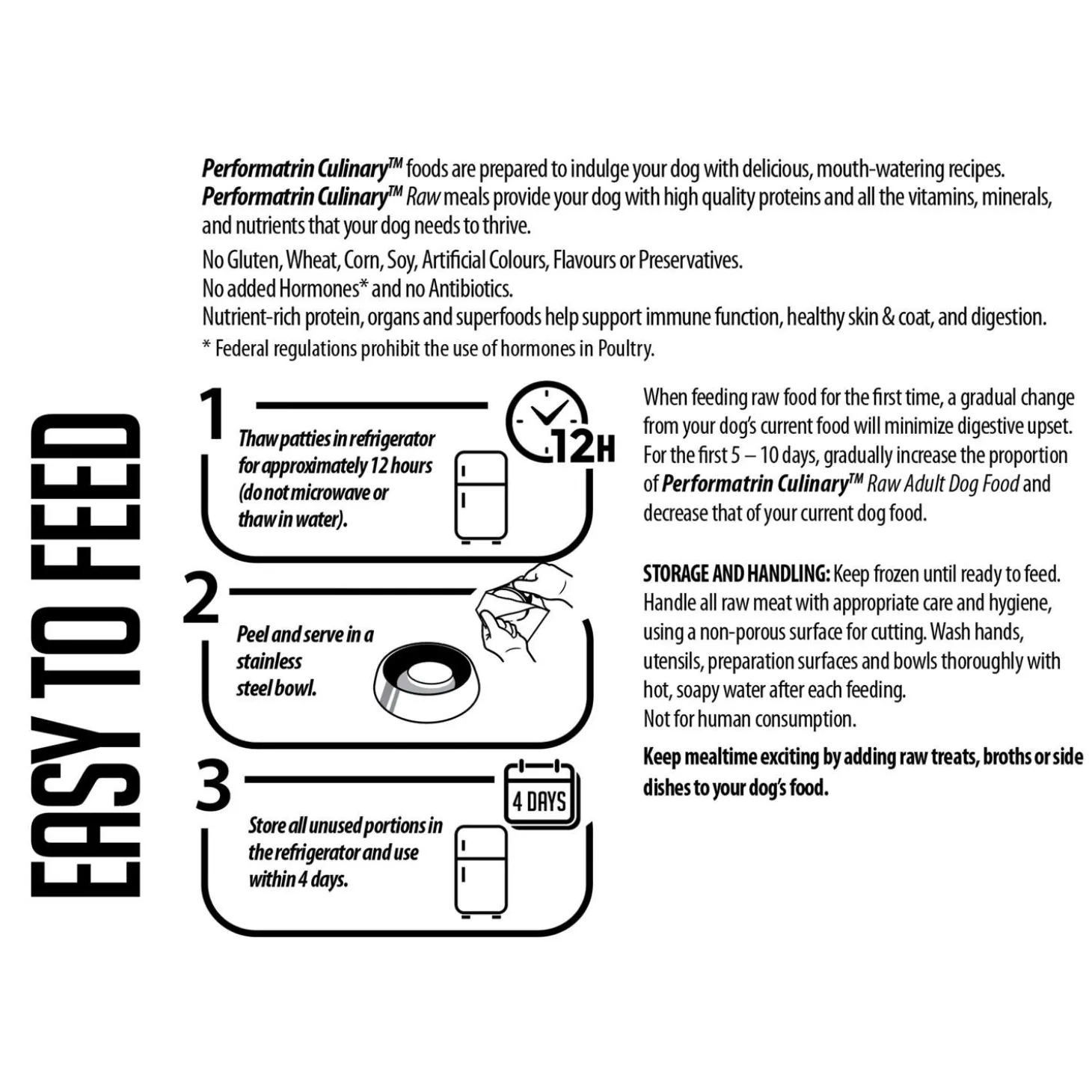 Performatrin Culinary Butcher’s Select Raw Chicken, Turkey & Beef Dinners Adult Dog Food is a great alternative if you are looking for less processed food. It is made with high quality muscle and organ meats, and all the vitamins, minerals, and other nutrients that a dog needs to thrive. With freshly prepared foods, containing 90% meat, bones and organs, and natural antioxidants from Superfoods like zucchini and blueberries, your dog will love these delicious mouth-watering recipes. All dinners are complete and balanced. The chicken & turkey dinners are a great mix of protein and beneficial fats suitable for all dogs. The beef dinner has a high protein content, making it ideal for high energy dogs. No measuring or weighing required. The easy to peel and serve patties take away the ick factor of raw meat.