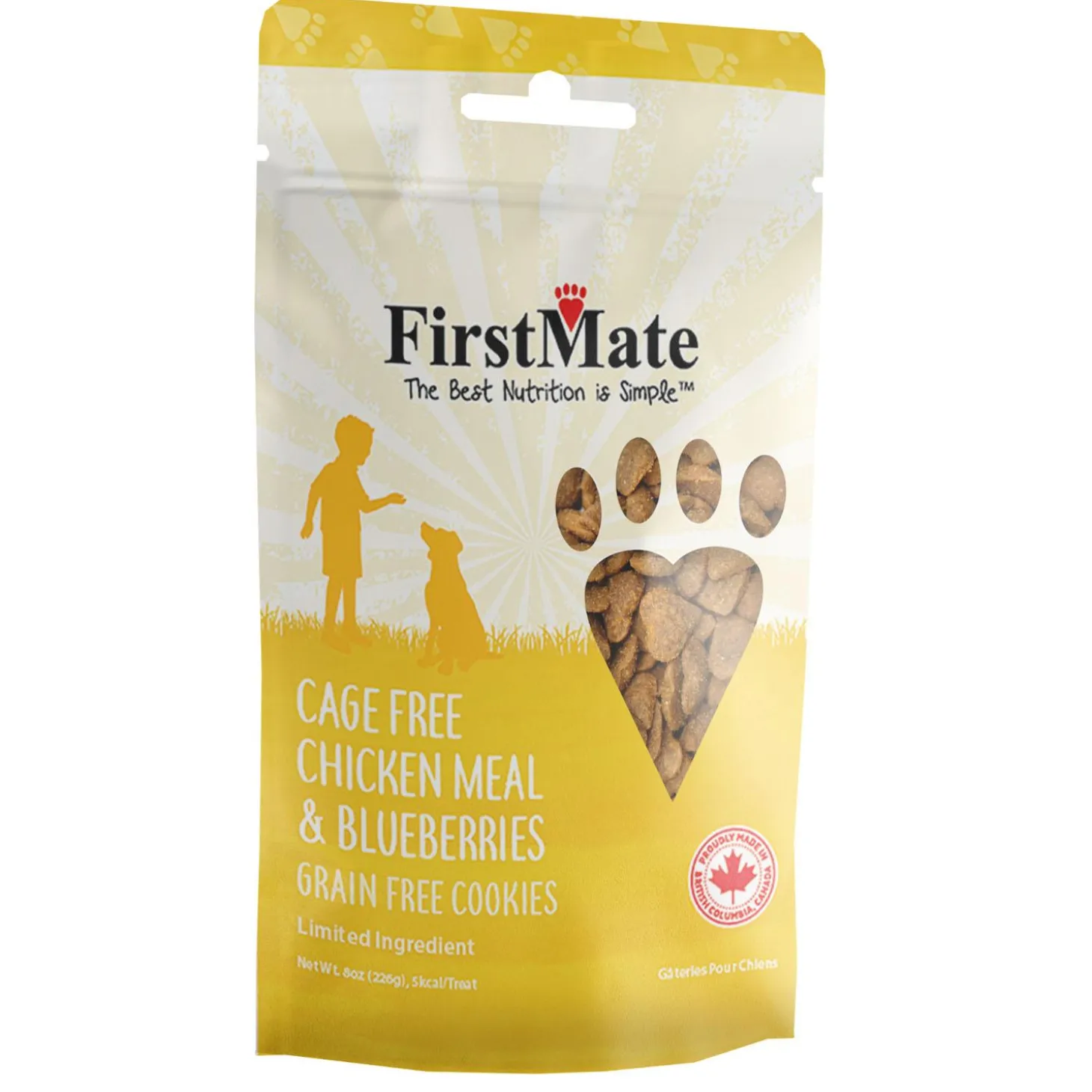 FirstMate Cage Free Chicken Meal & Blueberries Cookies Dog Treats are Limited Ingredient treats designed to be a meat based alternative to a typical biscuit. FirstMate proudly uses high quality animal protein and blueberries in every treat, helping provide the best quality for your dog. This grain, glycerine and pea free formula is ideal for everyday use as a treat or training aid for your dog.