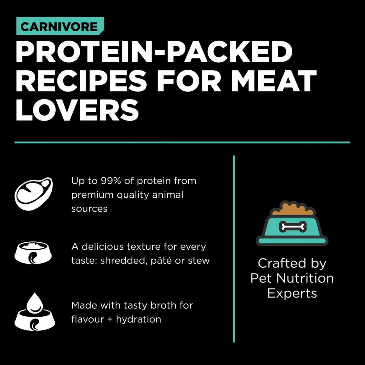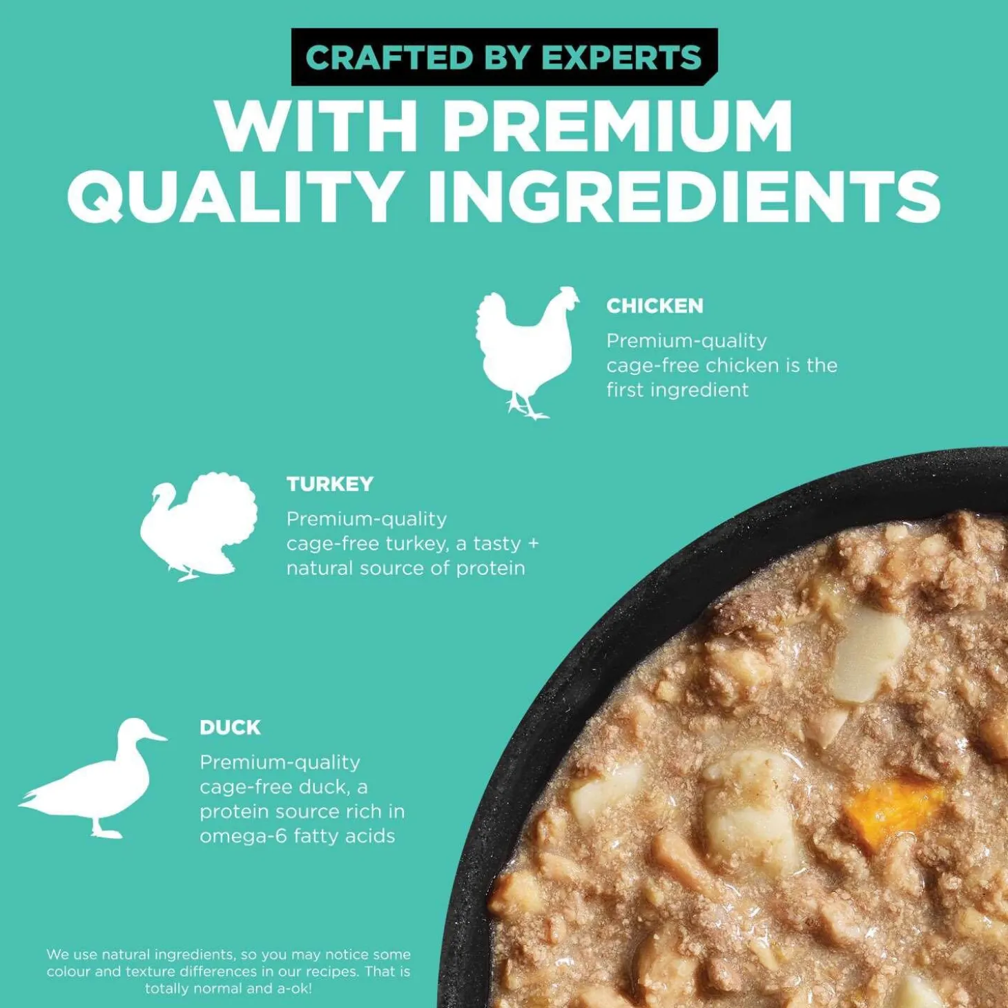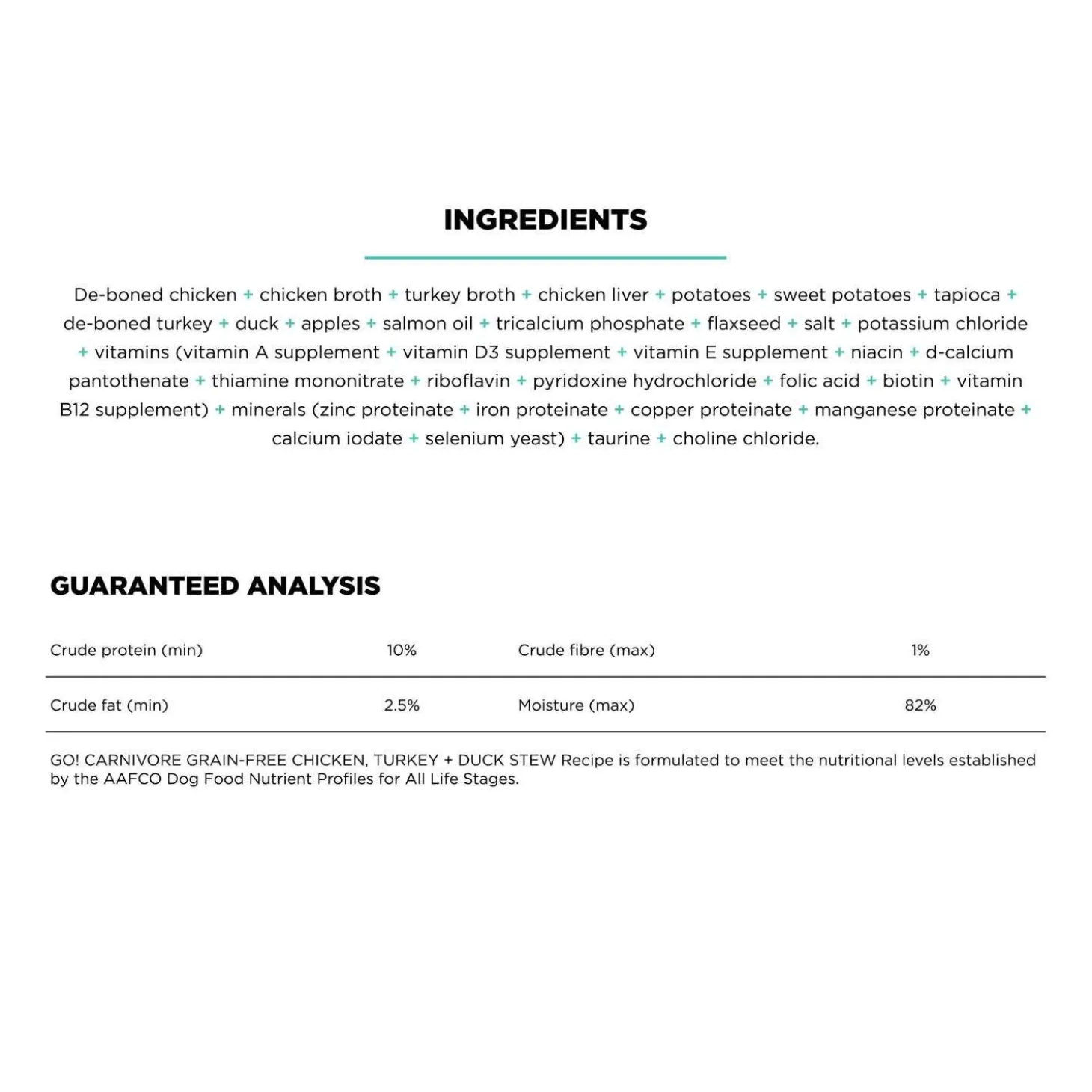 Go! Solutions Carnivore Grain Free Chicken, Turkey + Duck Stew Recipe Dog Food is a protein-packed meal packed with premium meat proteins to support their strong and lean muscles. Formulated in Ontario, Canada, this tasty wet dog food not only satisfies their taste buds but also provides complete and balanced nutrition for dogs of all ages.