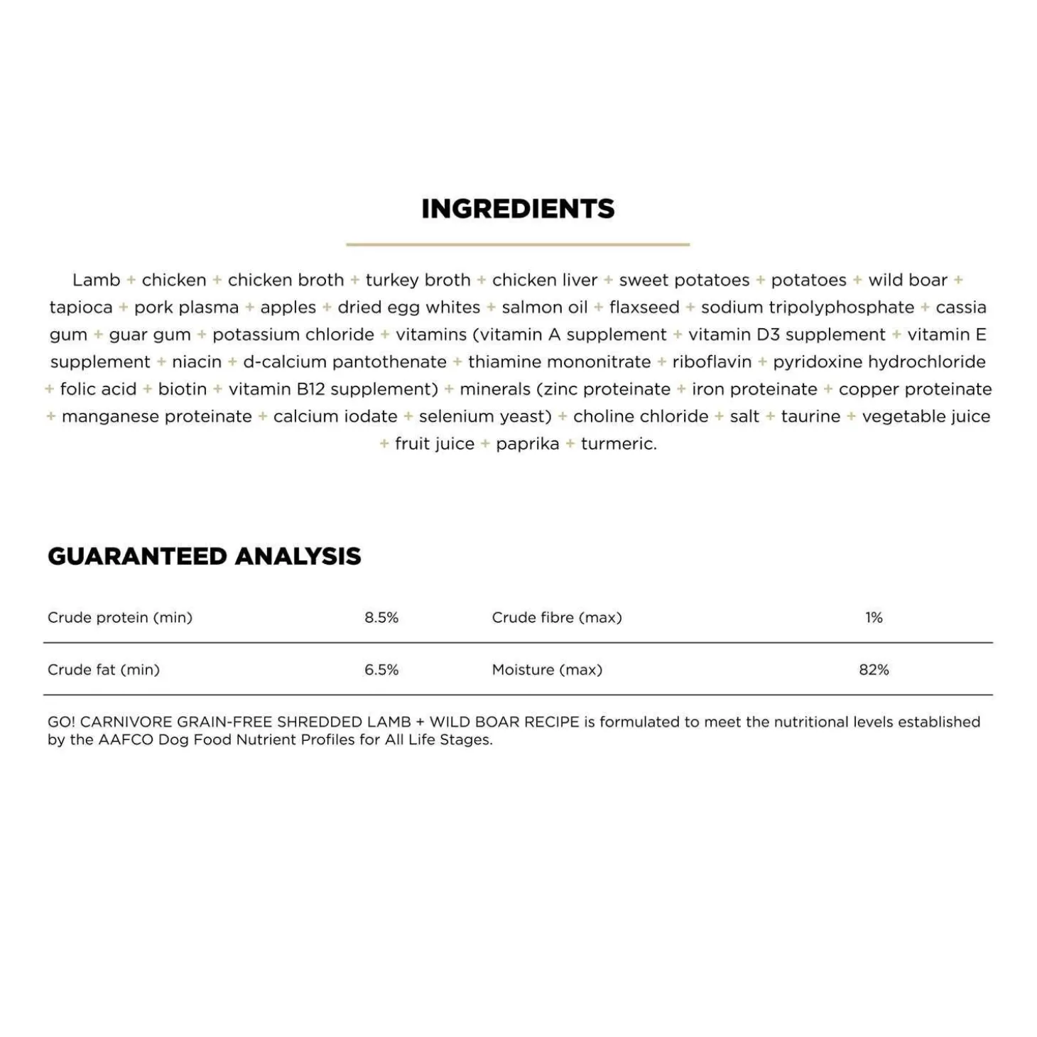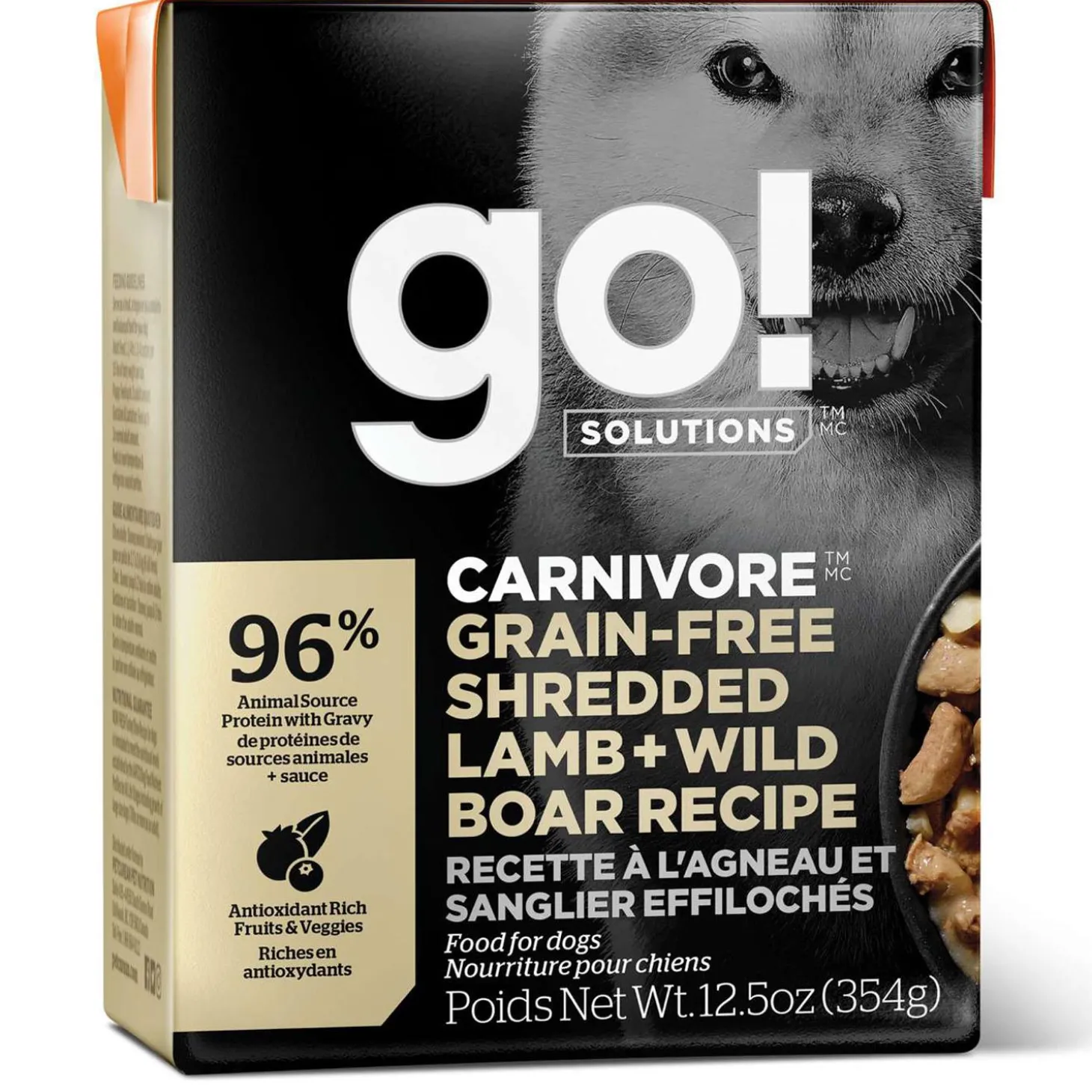 Go! Solutions Carnivore Grain Free Shredded Lamb + Wild Boar Recipe Dog Food is a protein-packed meal bursting with real meat to support their strong and lean muscles. Formulated in Ontario, Canada, this tasty wet dog food not only satisfies their taste buds but also provides complete and balanced nutrition for dogs of all ages.