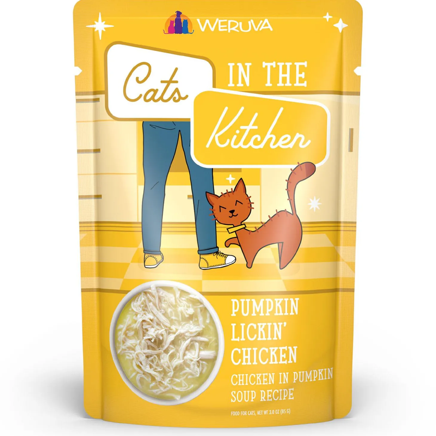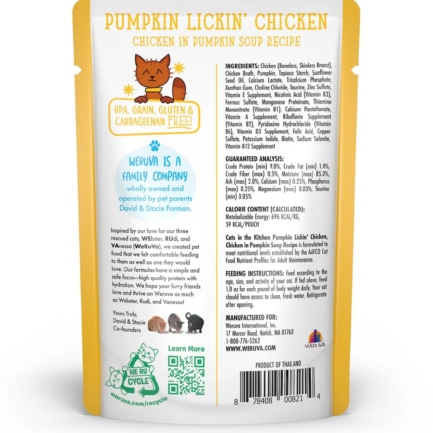 Weruva Cats in the Kitchen Pumpkin Lickin’ Chicken in Pumpkin Soup Recipe Adult Cat Food gives your cat a reason to lick their bowl clean! Featuring high-quality boneless, skinless white breast meat chicken in a flavourful pumpkin soup, this recipe is crafted to delight your kitchen carnivore with every bite.
