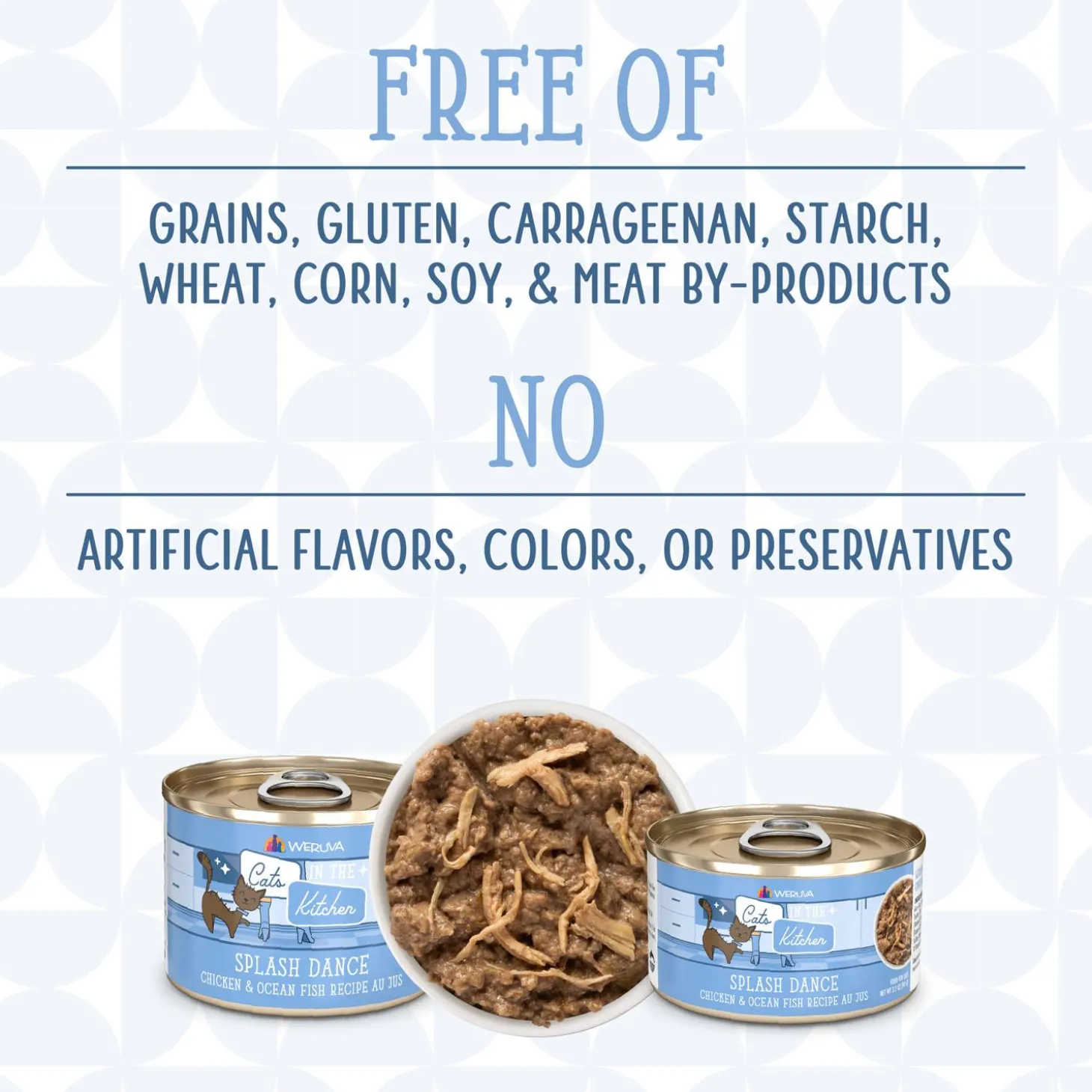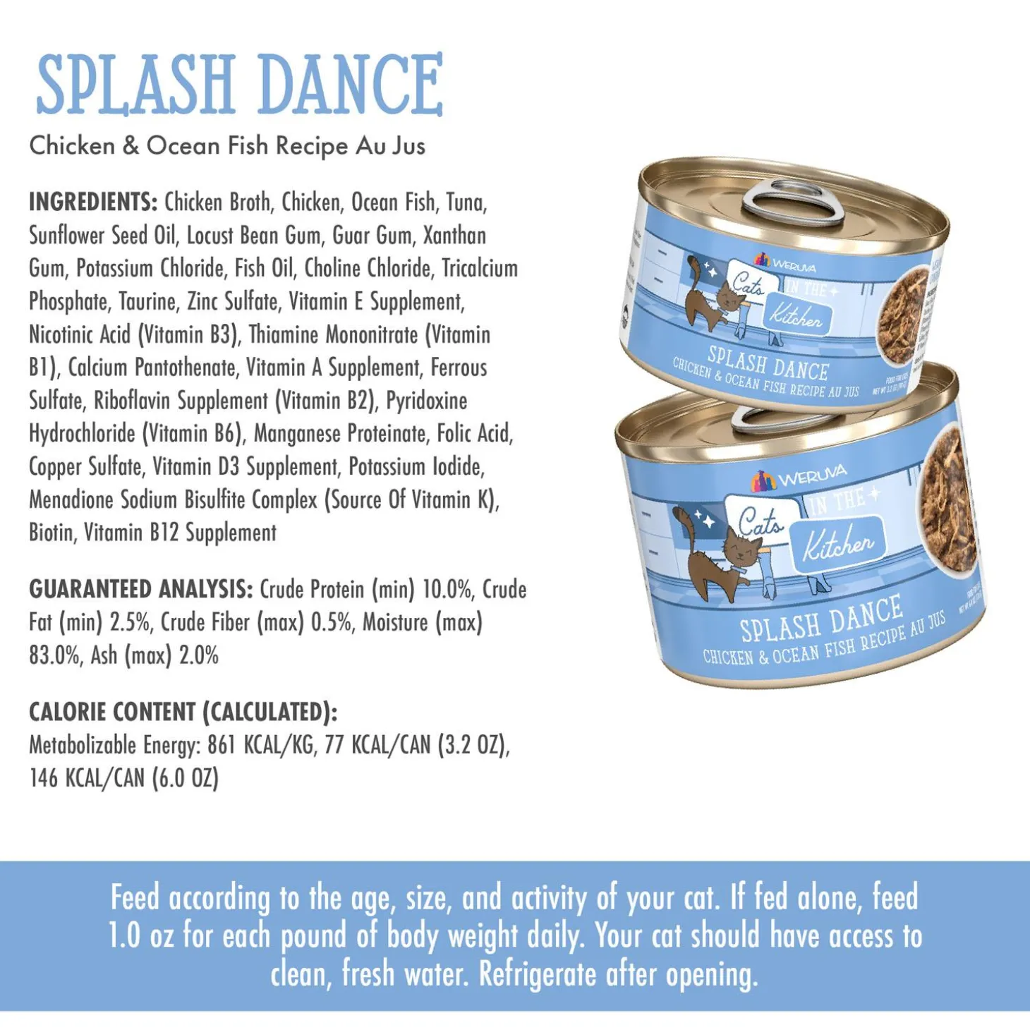 Weruva Cats in the Kitchen Splash Dance Chicken & Ocean Fish Recipe Adult Cat Food makes a splash at mealtime with this irresistible recipe! Featuring boneless, cage-free chicken and ocean fish in a flavourful au jus, it’s high in protein, low in carbs, starch-free, and crafted to satisfy your kitchen carnivore’s cravings.