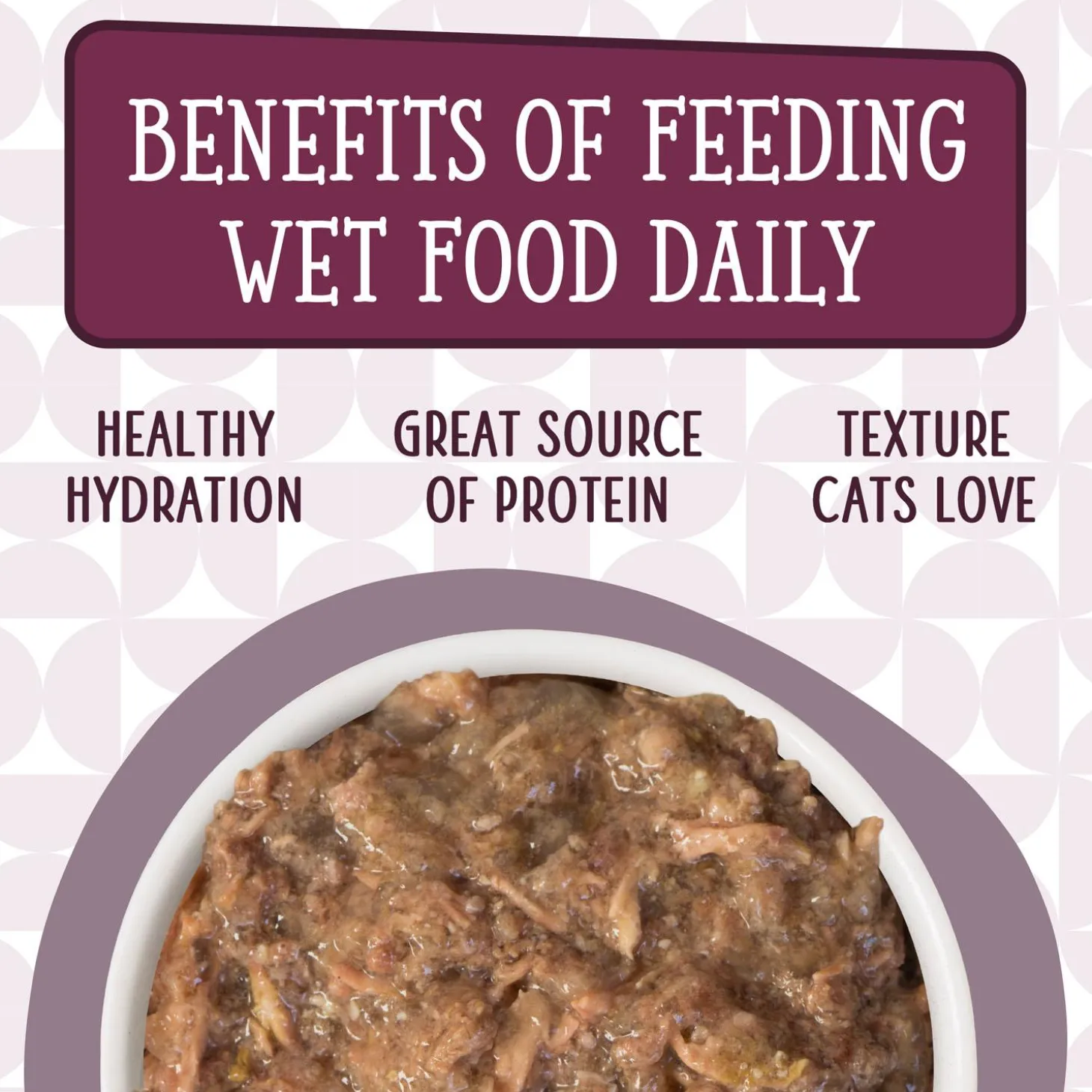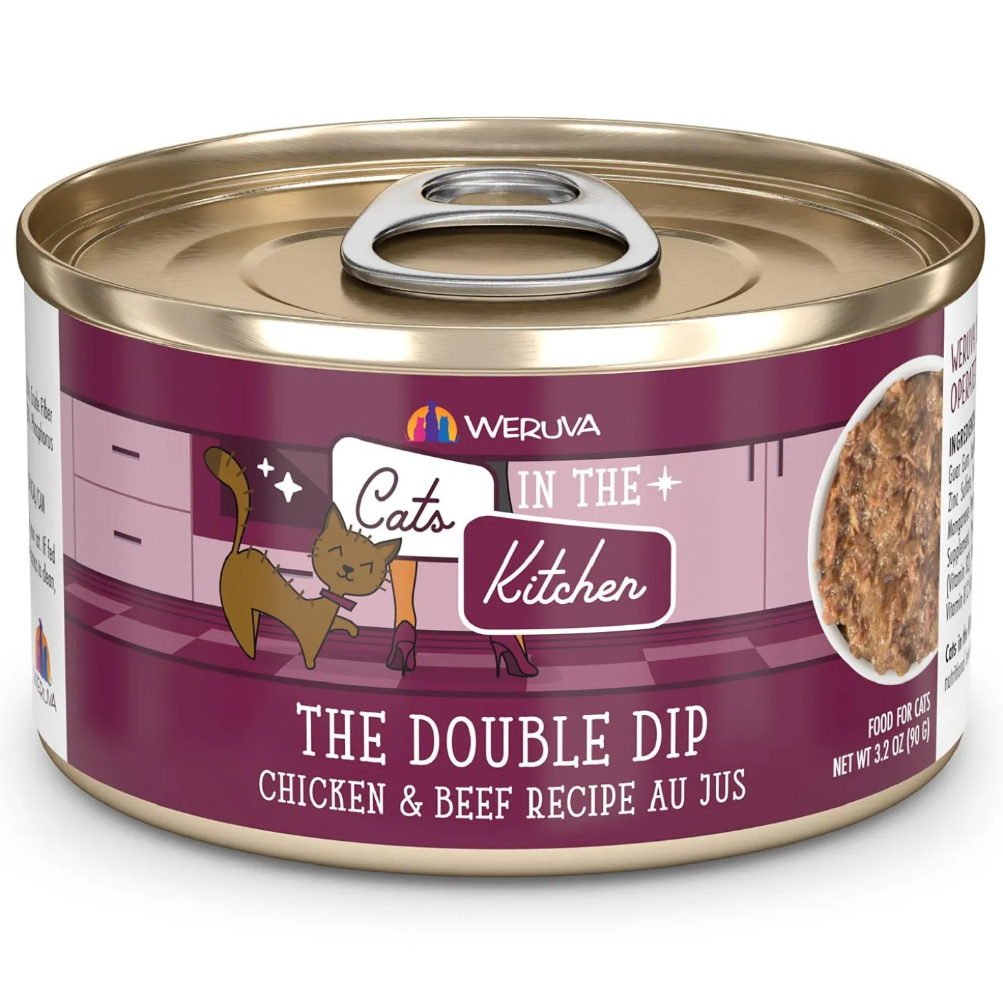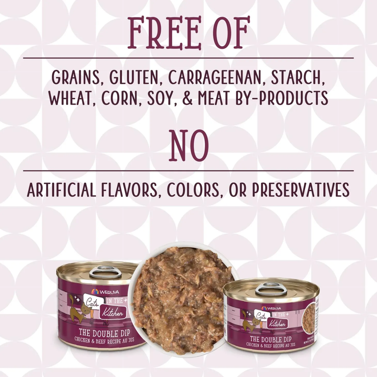 Weruva Cats in the Kitchen The Double Dip Chicken & Beef Recipe Adult Cat Food is twice the tasty proteins in one irresistible recipe! Featuring boneless, cage-free chicken and tender grass-fed beef in a flavourful au jus, it’s high in protein, low in carbs, starch-free, and crafted to satisfy your kitchen carnivore’s cravings.