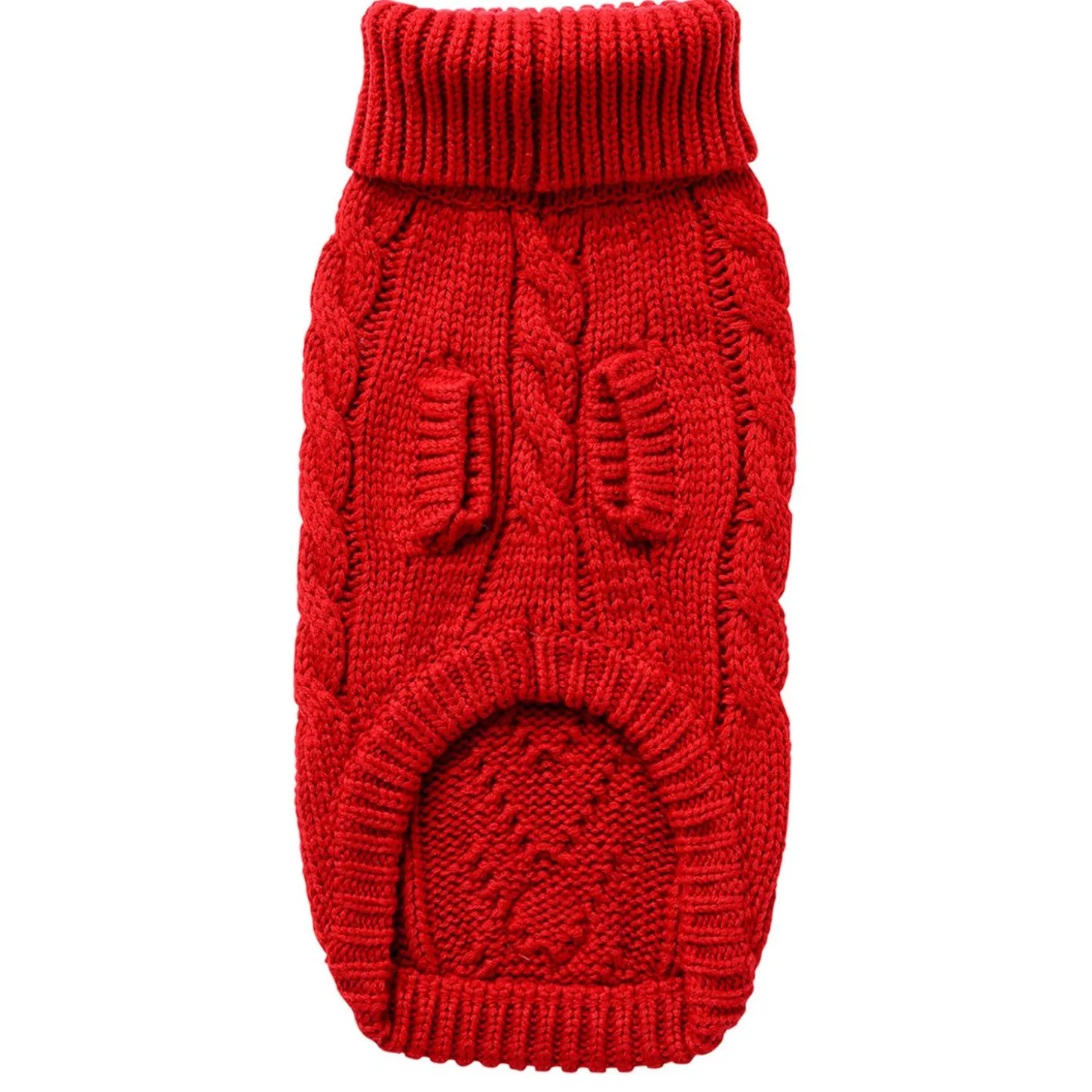 GF Pet Chalet Red Sweater is chunky and snuggly soft. The high turtleneck, ribbed arm holes and sculpted body shape make for a super comfy fit for both boy and girl doggies. A timeless and luxurious cable knit classic!