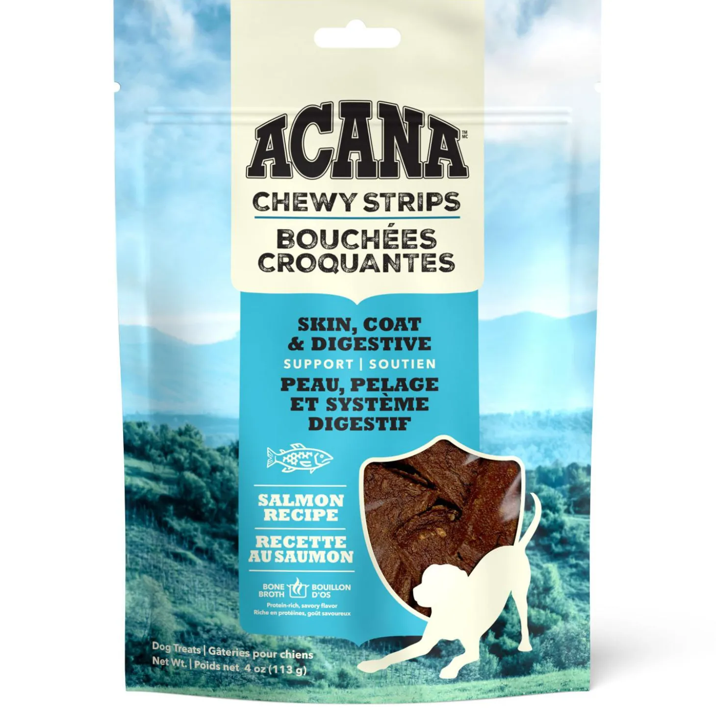 ACANA Chewy Strips Skin Coat & Digestive Support Salmon Recipe Dog Treats will delight your dog with their savoury flavour! crafted with just 5 key ingredients, including delicious wild-caught salmon and fibre-rich pumpkin, you can feel good about treating your dog. Every strip also helps support your dogs skin and coat with Omega-3 fatty acids from wild-caught salmon, and digestive health from fibre-rich pumpkin. Bone broth adds a burst of flavour, and sweet honey gives Chewy Strips a texture dogs love. Its the perfect snack for moments you want to treat your dog while also helping to support their wellbeing!