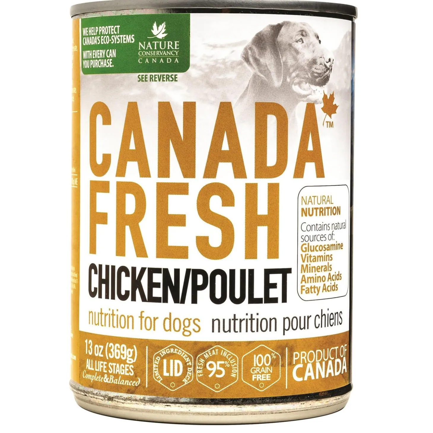 Canada Fresh Chicken Dog Food is made with chicken and chicken broth as the first ingredients. It’s naturally high in protein to satisfy your dog’s cravings for meat and support lean, active muscles. It contains health-promoting omegas from salmon oil, joint-friendly glucosamine, vitamins, minerals and essential amino acids for all-around, complete nutrition for pups of all ages.