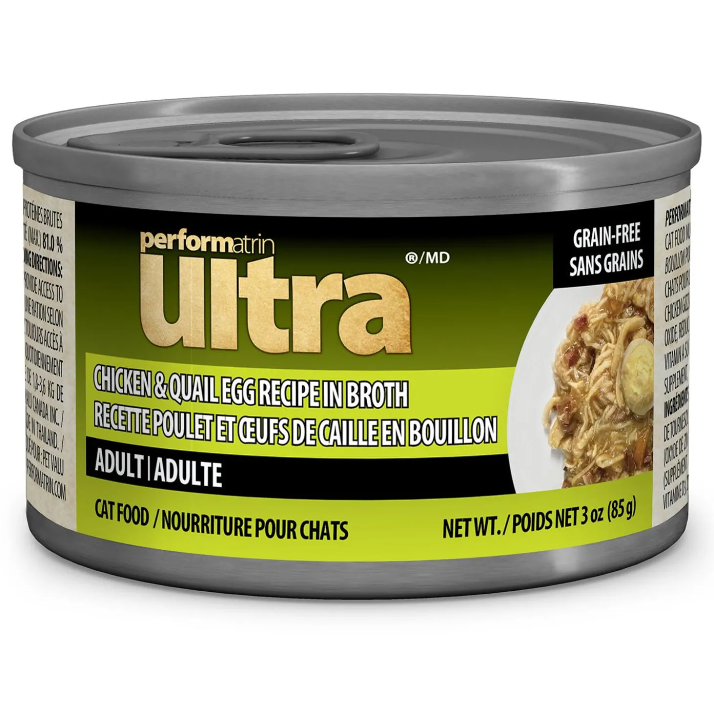 Performatrin Ultra Chicken & Quail Egg Recipe in Broth Adult Cat Food will have your cat licking their paws and asking for more! Made with only high-quality ingredients such as chicken, quail egg & organ meat, plus pumpkin, in a flavourful broth. This recipe is a great way to add hydration to your kitty’s meal. This recipe meets your cat’s daily requirements and promotes whole body health and wellness, and contains no grains, gluten, carrageenan, artificial preservatives, colours, or flavours.