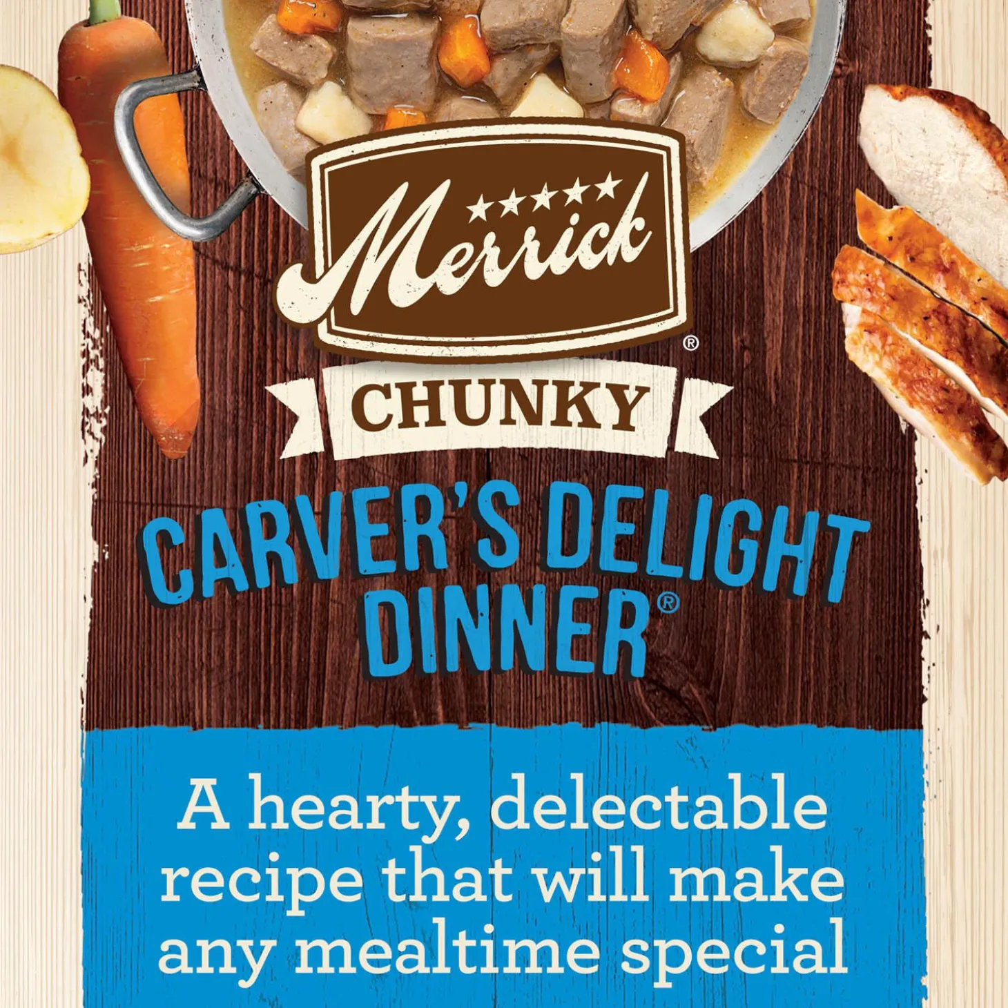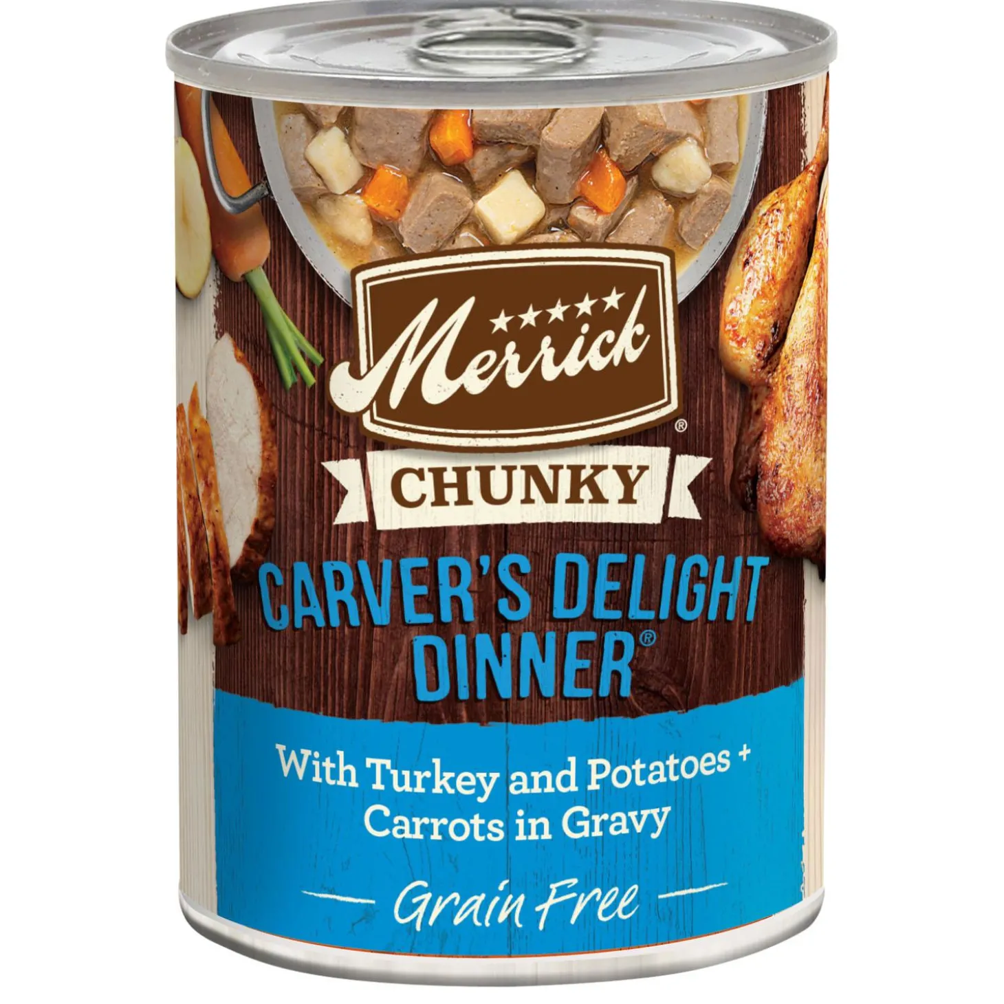 Merrick Chunky Carver’s Delight Dinner in Gravy Adult Dog Food is a premium grain free recipe that is crafted with real deboned chicken as the number one ingredient and contains high protein to support your dog’s lean muscle mass and healthy energy levels. Additionally, this wholesome, healthy dog food is crafted with a holistic blend of soft carrots and potatoes together in a savoury gravy that adds flavour and moisture to your dog’s diet. Use this canned food as a topper for your dog’s dry kibble or as a delicious standalone meal your dog will love. Grain free, chunky, and natural, with added vitamins and minerals, this real meat dog food is crafted without artificial flavours or preservatives.