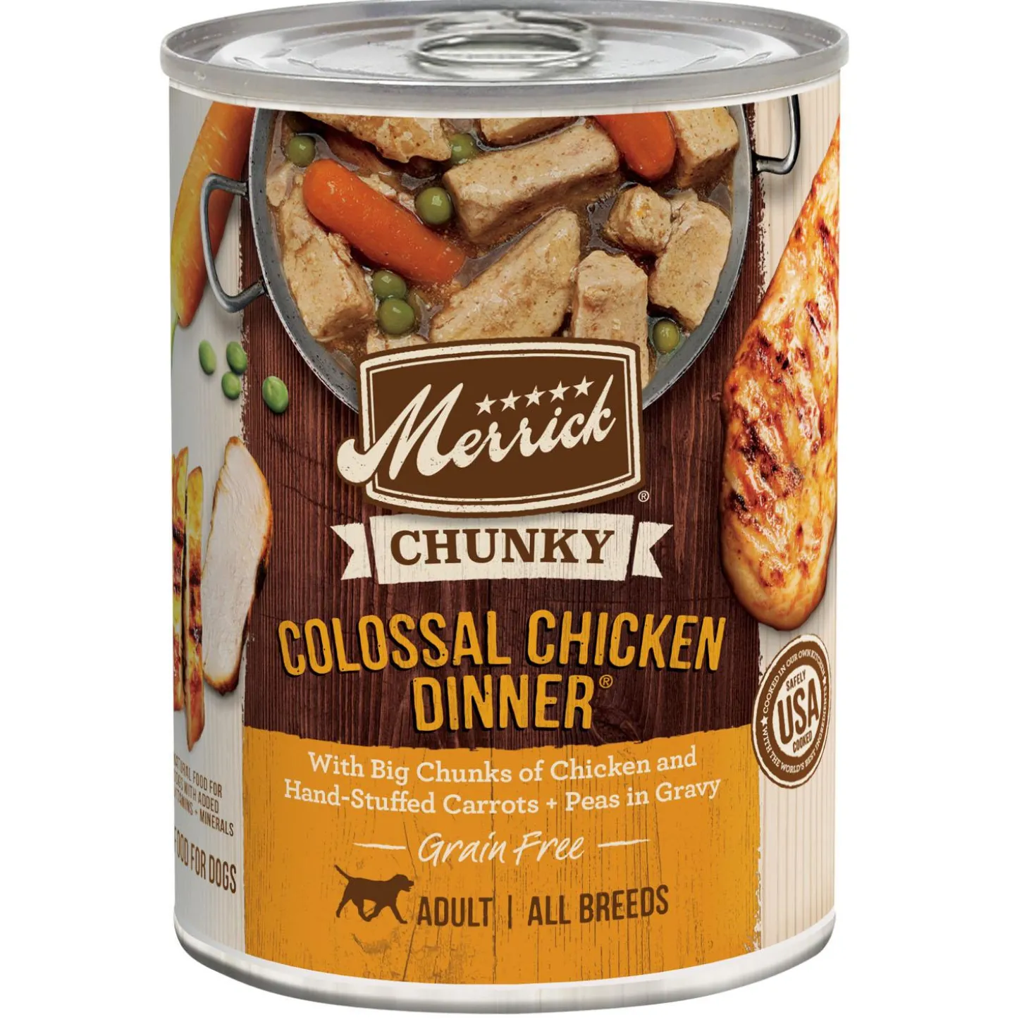 Merrick Colossal Chicken Chunky Dinner Adult Dog Food is the perfect meal for your pup. The first ingredient in this delectable, real meat dog food is always real, wholesome USDA-inspected deboned chicken. Pop open a can of this adult dog food grain free recipe and fill your dog’s bowl with the big chunks of chicken with hand-stuffed peas and carrots, all in a mouth-watering gravy for a natural dog food. This canned dog food recipe makes any mealtime special, and the addition of a savory gravy gives your dog something to look forward to. This Merrick grain free dog food canned recipe can be served as a topper for dry kibble or a standalone meal. Merrick wet dog food comes in a convenient pull-tab can that makes preparing your dog’s meal quick and easy. Merrick dog food recipes are crafted in Hereford, TX kitchen and cooked in the USA.