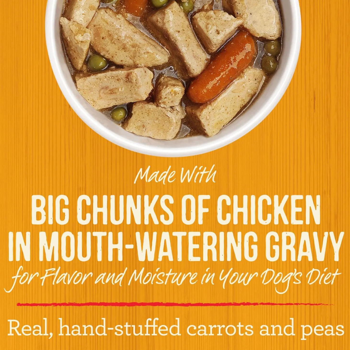 - Healthy dog food with vegetables like hand-stuffed peas and carrots and big chunks of chicken, prepared in a savory dog food gravy for added moisture