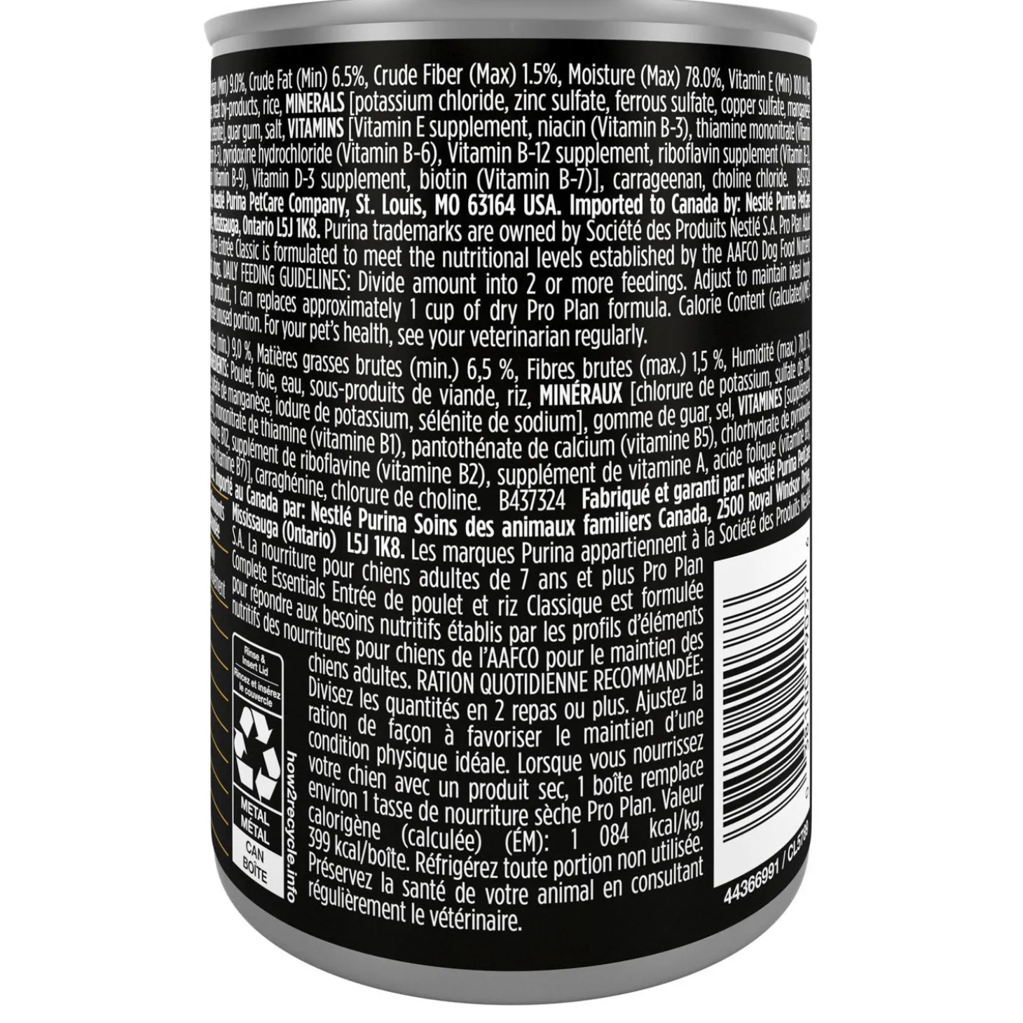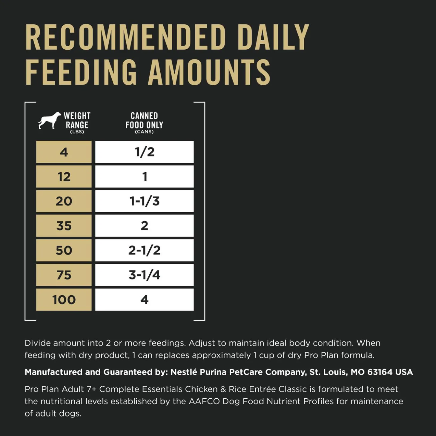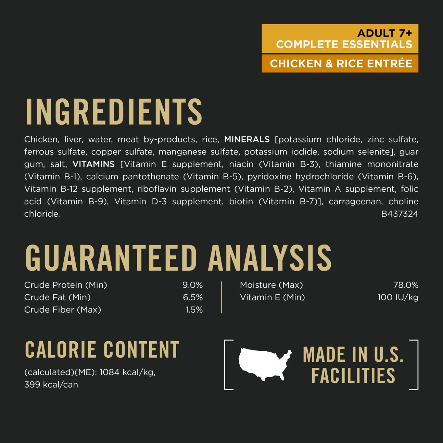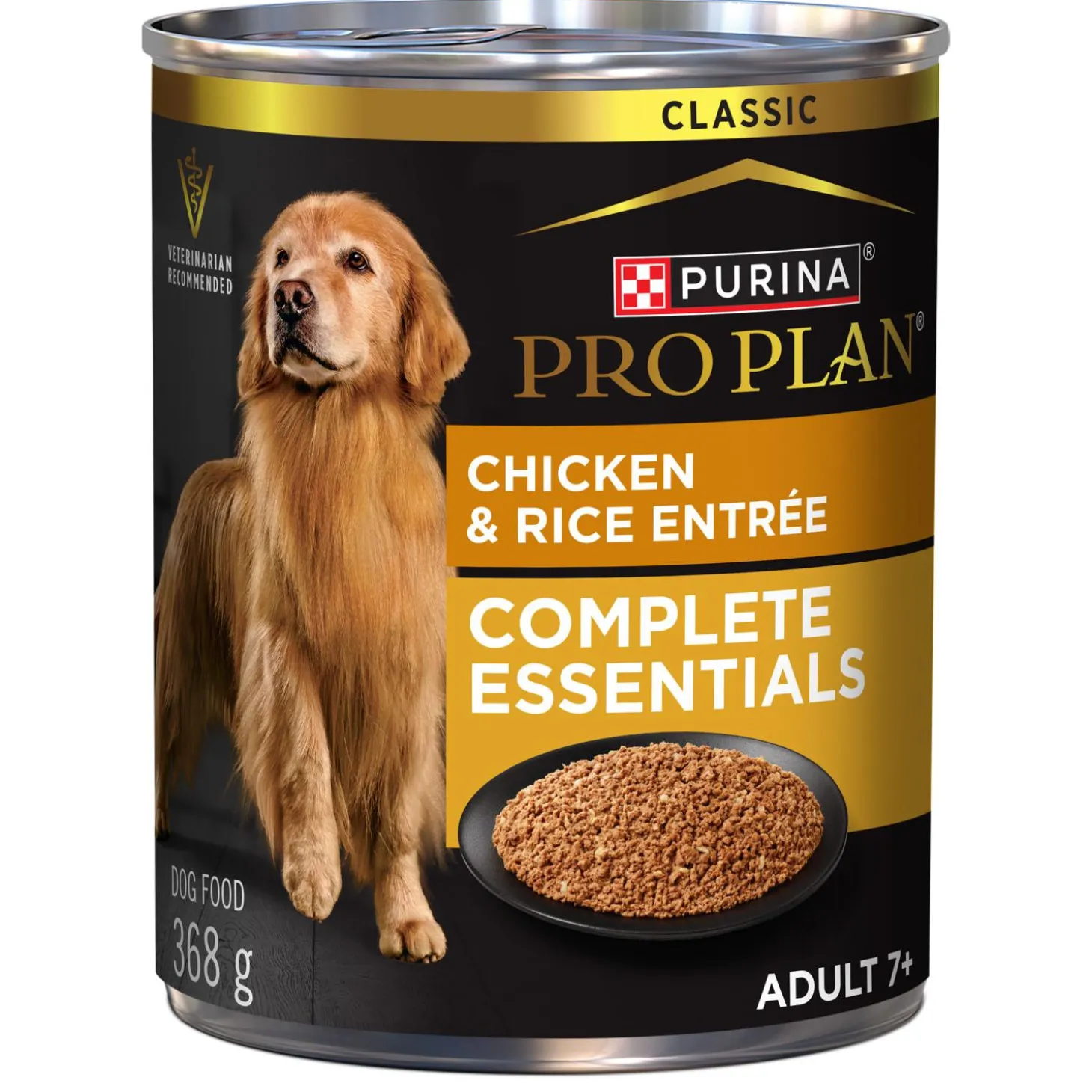 Purina Pro Plan Complete Essentials Chicken & Rice Entree Senior Dog Food is an advanced formula that supplies optimal nutrition for dogs ages 7 and older to support their unique needs. Pet nutritionists select every ingredient in this canned dog food for a specific nutritional or functional purpose. Real chicken in this senior dog food delivers high-quality protein in every serving to help older dogs maintain an ideal body condition. It is formulated as a high-quality dog food with the targeted nutrition you want and without ingredients you don’t. No corn, wheat, soy or potatoes, and minus any artificial flavours or colours, so it meets your dog’s taste preferences and your ingredient preferences too. Give your senior dog the outstanding nutrition they deserve when you make this Purina Pro Plan dog food part of their daily eating regimen.
