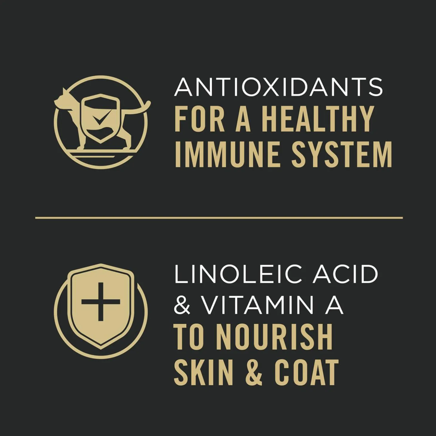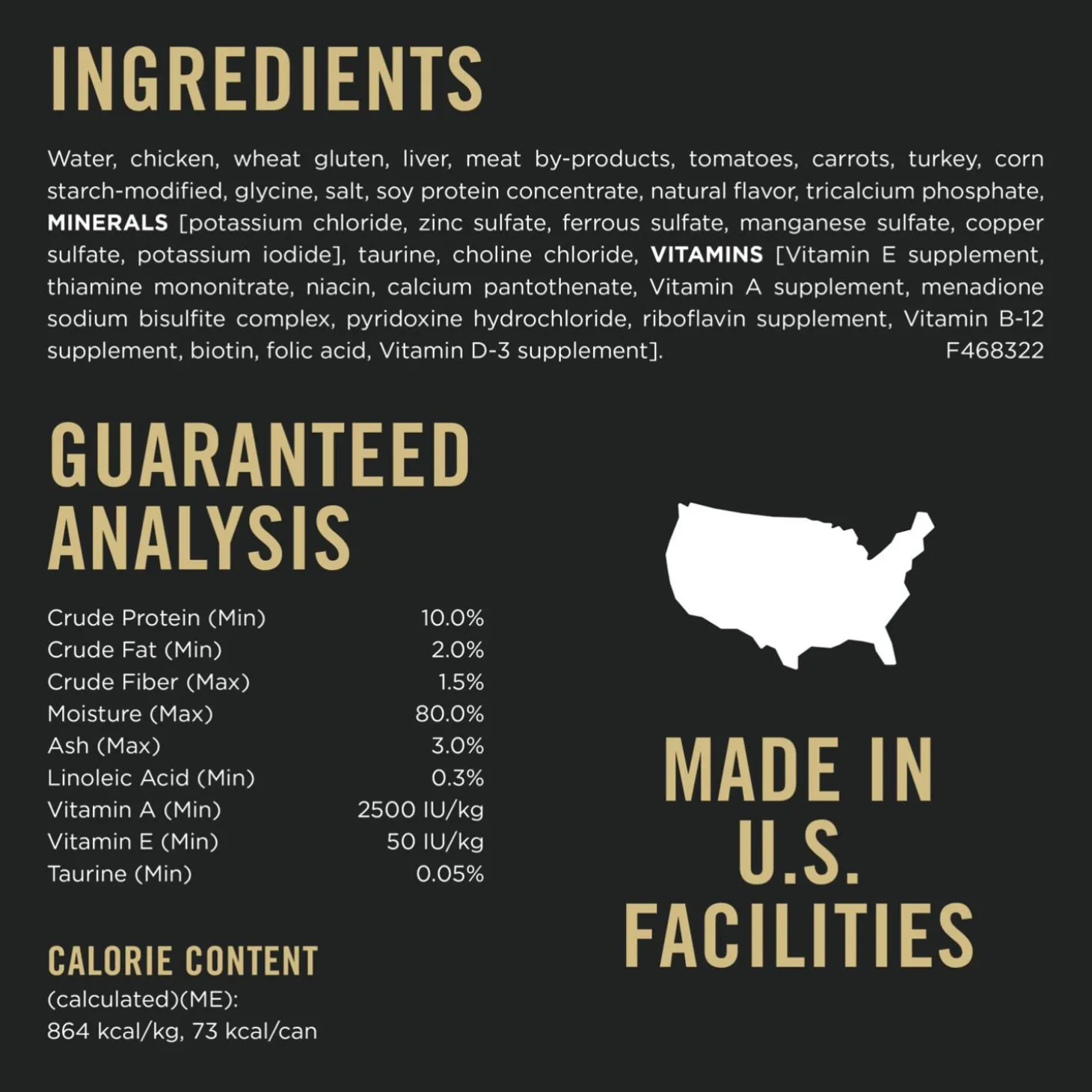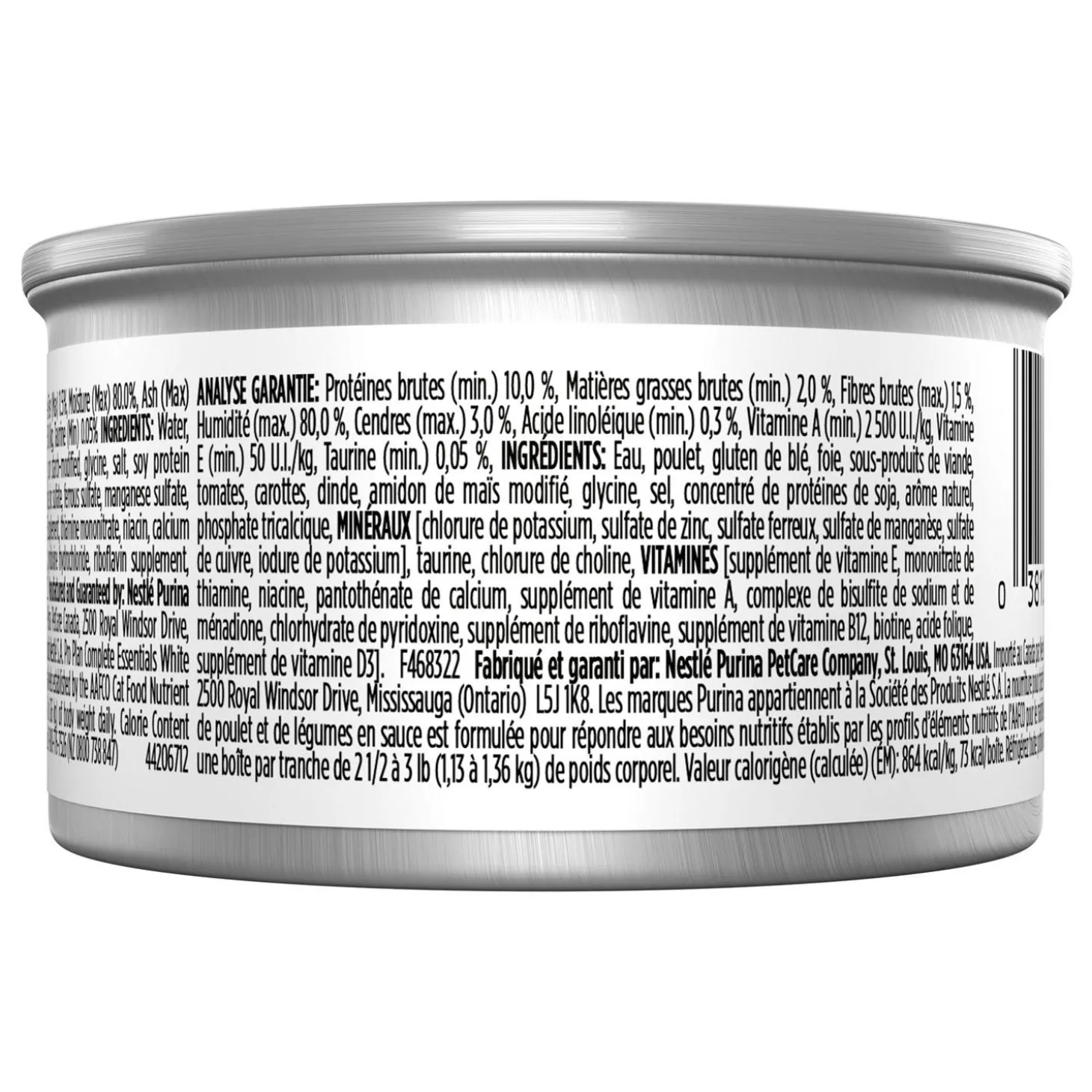 Purina Pro Plan Complete Essentials White Meat Chicken & Vegetable Entree in Gravy Adult Cat Food is a premium cat food is made with real white meat chicken and vegetables for a taste cats love. Every high-quality ingredient is carefully chosen for a specific purpose – Linoleic acid and vitamin A in every serving nourish their skin and coat, and antioxidants help to support a healthy immune system. Plus, a high protein level in this food helps them maintain lean muscle, and vitamin A and taurine support their healthy vision. This soft cat food provides 100 percent complete and balanced nutrition for adult cats with no artificial colours or preservatives. A rich gravy adds flavour and moisture, while the tender texture and delectable taste combine to create a sensory experience your cat is sure to enjoy. Offer your cat the unique greatness in this Purina Pro Plan Complete Essentials canned cat food for a tasty and nutritious mealtime option.