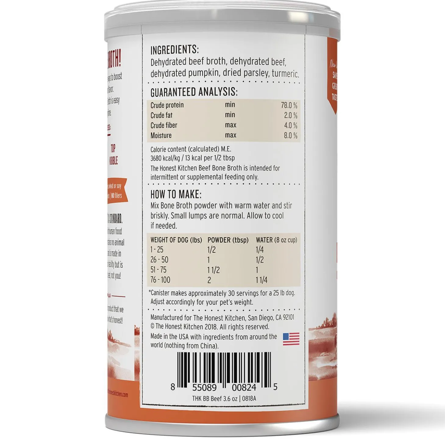 The Honest Kitchen Daily Boosters Beef Bone Broth Dog Supplement will give your dog a daily boost of superfood nutrients. Simply mix with warm water to give your pet a mouthwatering drink, pour over kibble as a delectable gravy, or use it to rehydrate an Honest Kitchen meal to make dinner even more richly flavourful. This Instant Beef Bone Broth with nourishing parsley, warming pumpkin, and turmeric is oh-so-satisfying to your pet’s taste buds.