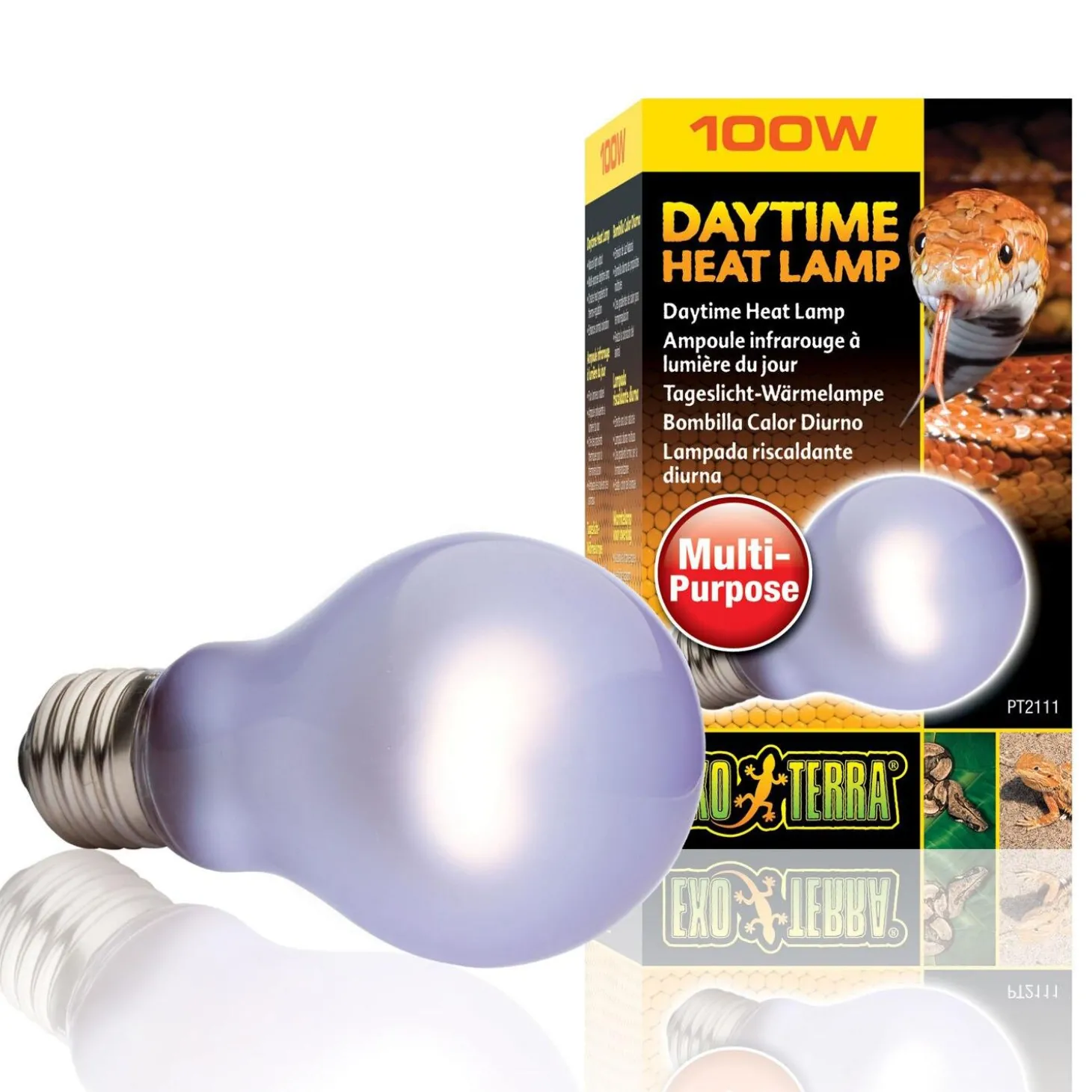 Exo Terra Daytime A21 Heat Lamp is a broad-spectrum daylight lamp with a Neodymium sleeve. The spectrum is ideal for plant’s photosynthesis and the UVA (ultraviolet A) light contributes to reptiles’ physiological well-being. Another important factor is the heat emitted by this bulb is to increase the over all ambient temperature in the terrarium.